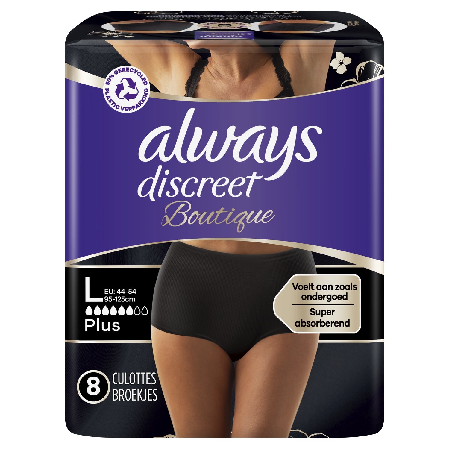 High-waisted panties to fit your body. Ideal for heavy leaks, with absorbency equivalent to a full bladder, Feels like real underwear. Super absorbent, Up to 100% discretion and protection. Dermatologically tested, OdourLock technology locks in odors, Fabric-like feel thanks to soft materials around the waist, With a flexible core and a feminine design that fits the shape of the body, Designed differently: they transform liquid into gel and retain it in the ultra-absorbent core of the panties, Always Discreet for bladder weakness is a medical device. Read the instructions for use on the packaging