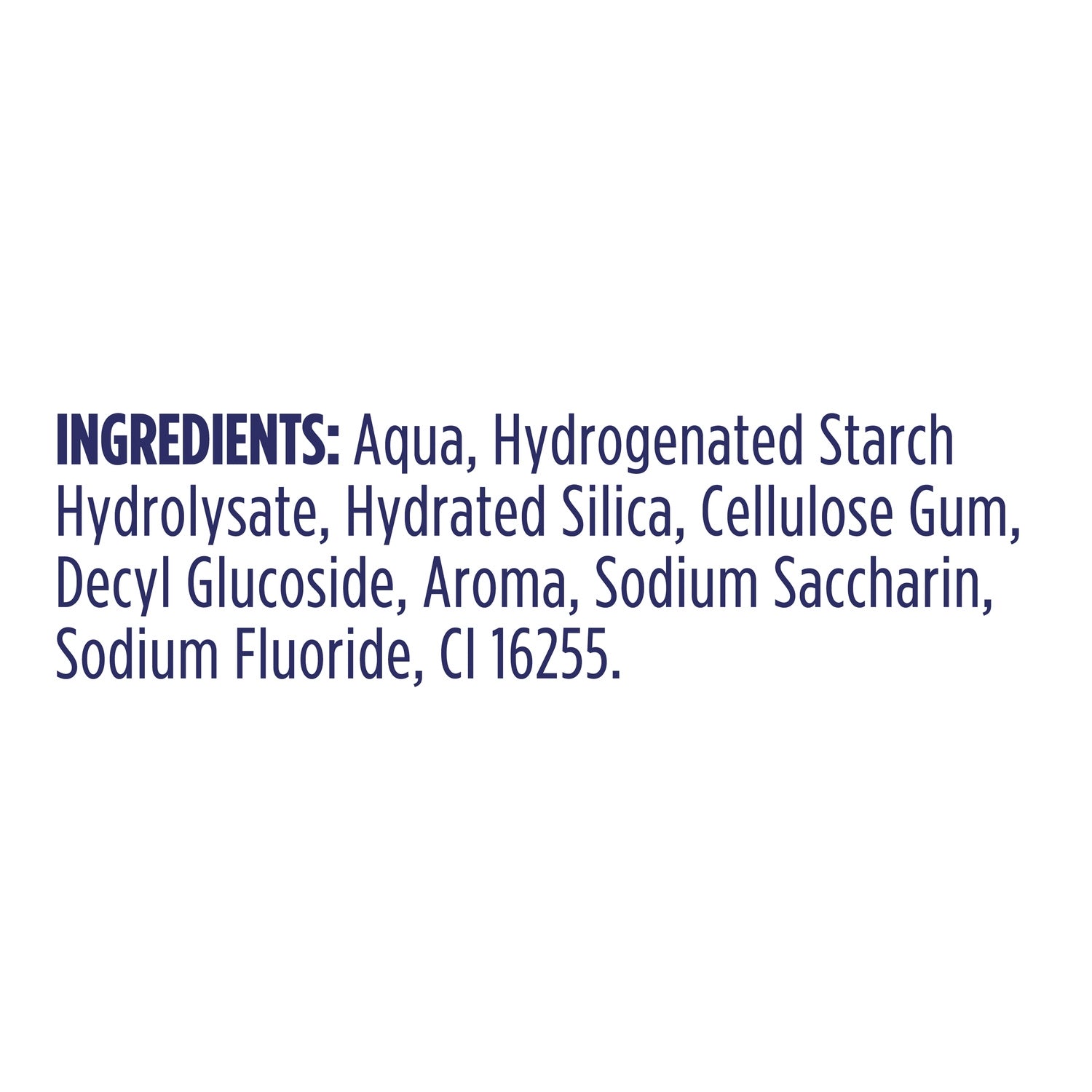 Ingredients: Aqua, Hydrogenated Starch Hydrolysate, Hydrated Silica, Cellulose Gum, Aroma, Decyl Glucoside, Sodium Fluoride, Sodium Saccharin, CI 16255.