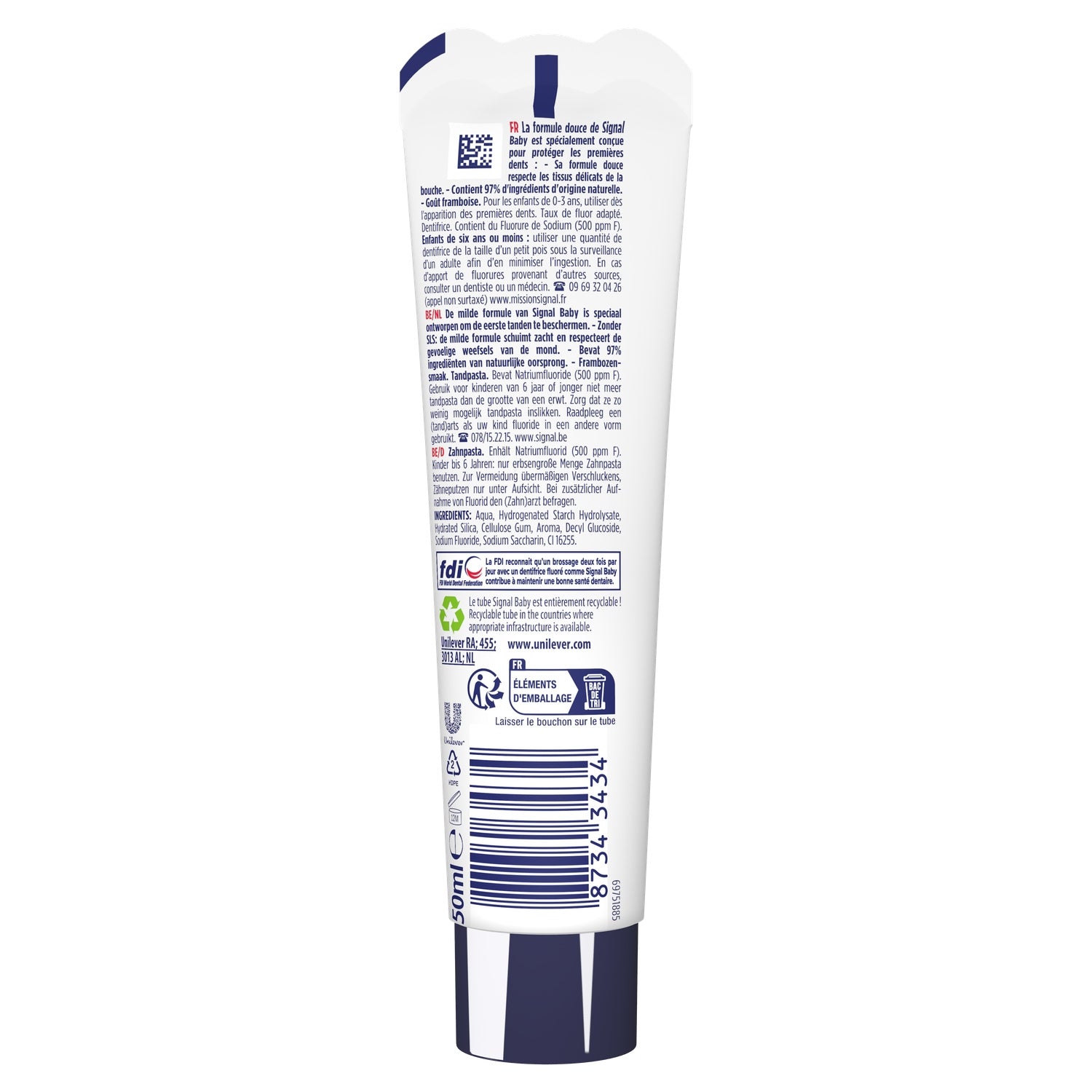 Signal Baby raspberry flavor children's toothpaste has been specially designed for children from 0 to 3 years old,Its gentle formula is suitable for the first baby teeth,Your child will love the delicate raspberry flavor of this toothpaste,Signal Baby toothpaste protects baby's teeth against cavities while respecting the gums,Signal Baby children's toothpaste can be used as soon as the first teeth appear,This toothpaste contains a level of Sodium Fluoride (500ppm F) suitable for toddlers