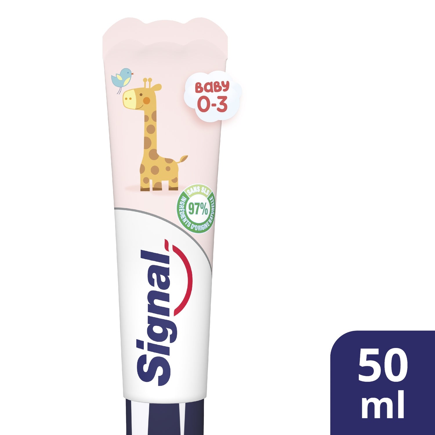Signal Baby, my first toothpaste. Signal Baby children's toothpaste is specially designed for first teeth. Its gentle formula protects babies' teeth from cavities while caring for their gums. Your child will love its delicate raspberry flavor. Signal Baby toothpaste is ideal for children aged 0 to 3 years, and its fluoride dosage is suitable for toddlers. The easiest way to prevent cavities is to brush your teeth twice a day with the right toothpaste and toothbrush. By teaching children from an early age, we help them develop good oral hygiene habits for life. At Signal, we believe your smile is an expression of your personality and self-confidence. Our mission: to improve oral health for everyone, so that each of us can unleash the power of our smile. Signal has been supporting the French since 1961, teaching them the right habits from a young age and demonstrating the importance of brushing twice a day, morning and evening. We offer toothpastes suitable for all age groups. With Signal, every smile counts!