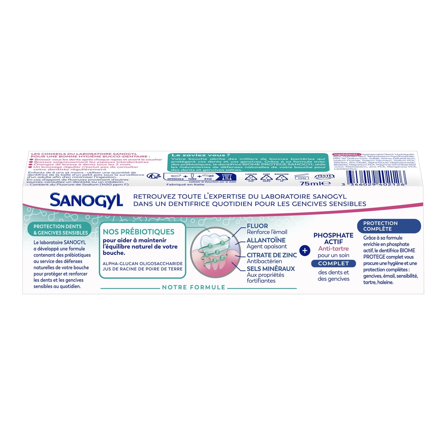 Sanogyl Biome Protège Complet, a toothpaste with prebiotics to help maintain your mouth's natural balance and active phosphate, an anti-tartar for healthy teeth and gums.
