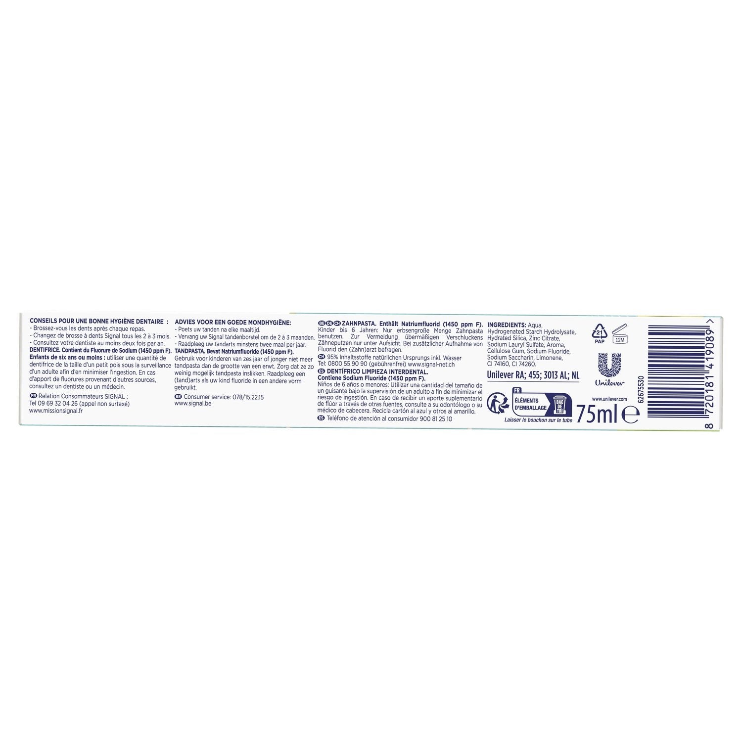 For a fully protected and healthy mouth day after day, choose Signal Integral 8 Interdental. With a prebiotic effect, its PRO-ZINC™ technology strengthens your mouth's natural defenses by increasing good bacteria and reducing bad ones. Its new formula removes 3x more plaque² and contains microparticles to reach interdental spaces, even in hard-to-reach areas. It also provides 24-hour antibacterial action and 3x more effective complete protection¹: healthy teeth, gums, cheeks, and tongue. Made with 95% natural ingredients, it is suitable for the whole family. This Integral 8 toothpaste offers 8 actions: cavity protection, gum protection, reinforced enamel, whitening action, fresh breath, anti-plaque, anti-tartar, and sensitivity. In addition, its tube is fully recyclable. Also discover the whitening toothpaste Signal Integral 8 Prebiotic Whitening Toothpaste. For good oral hygiene for the whole family, follow these simple steps: (1) In the morning, brush your teeth with Signal toothpaste and toothbrush, and rinse your mouth with Signal mouthwash. (2) During the day, freshen your breath with Signal mouthwash. (3) In the evening, brush your teeth with Signal toothbrush and toothpaste and rinse with Signal mouthwash. Remember to change your toothbrush every three months and visit the dentist regularly. ¹In vivo study measuring the reduction of bacteria on teeth, gums, cheeks and tongue compared to a conventional fluoride toothpaste, after 28 days of twice-daily brushing.