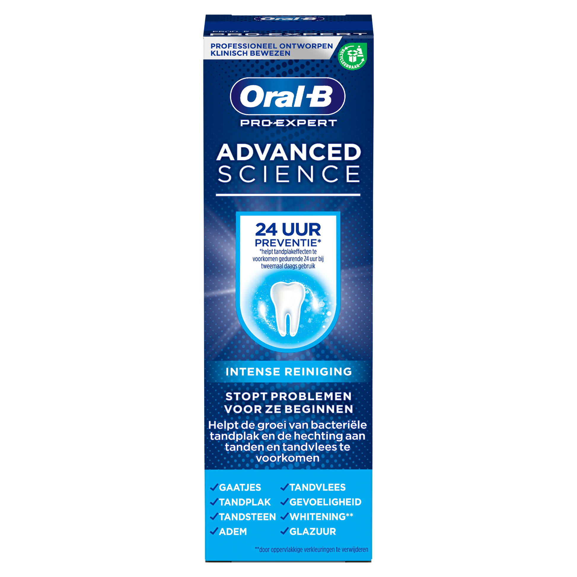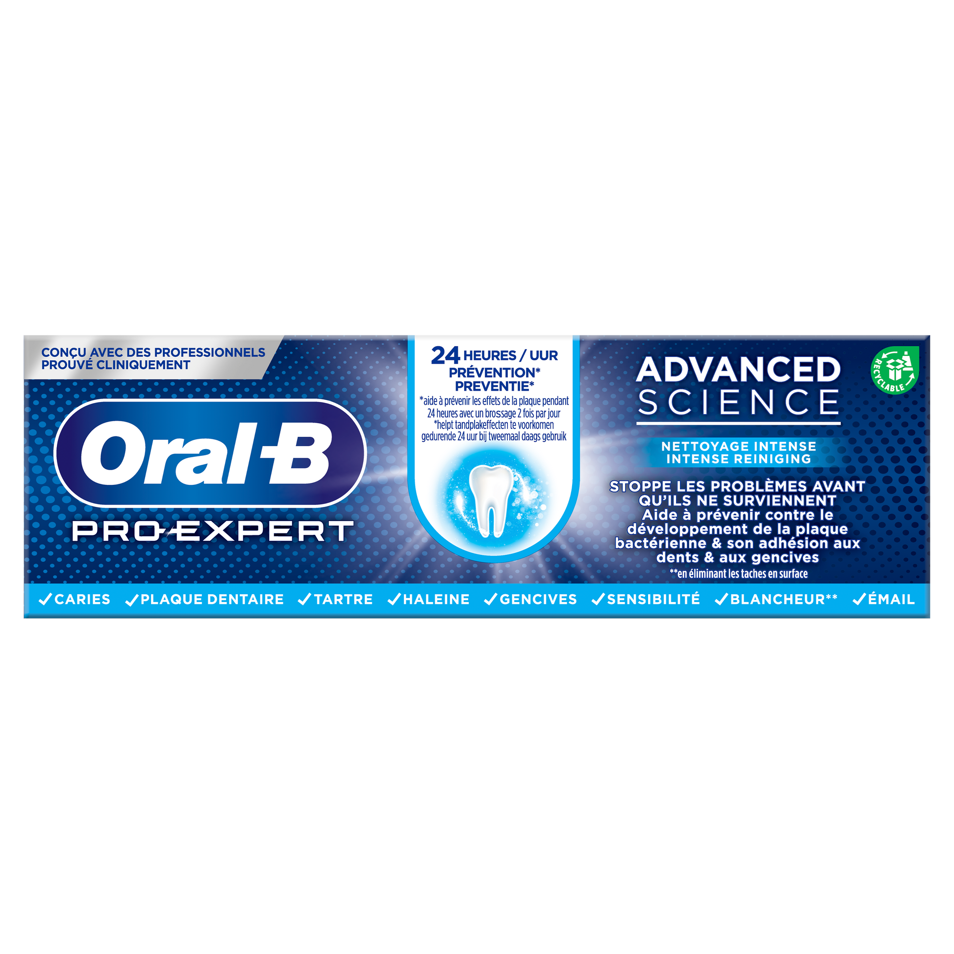 Oral-B Pro-Expert Advanced Science Intense Clean toothpaste is professionally designed & clinically proven to stop problems before they start, helping prevent the effects of bacterial plaque and its adhesion to teeth & gums for 24 hours when used twice a day.