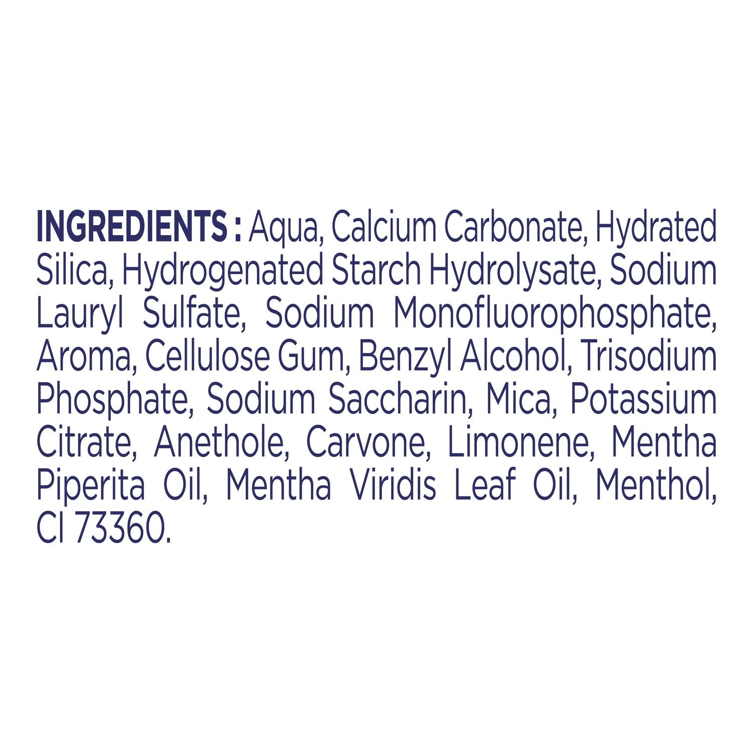 Ingredients: Aqua, Calcium Carbonate, Hydrated Silica, Hydrogenated Starch Hydrolysate, Sodium Lauryl Sulfate, Sodium Monofluorophosphate, Aroma, Potassium Citrate, Cellulose Gum, Benzyl Alcohol, Trisodium Phosphate, Sodium Saccharin, Mica, Limonene, CI 73360.