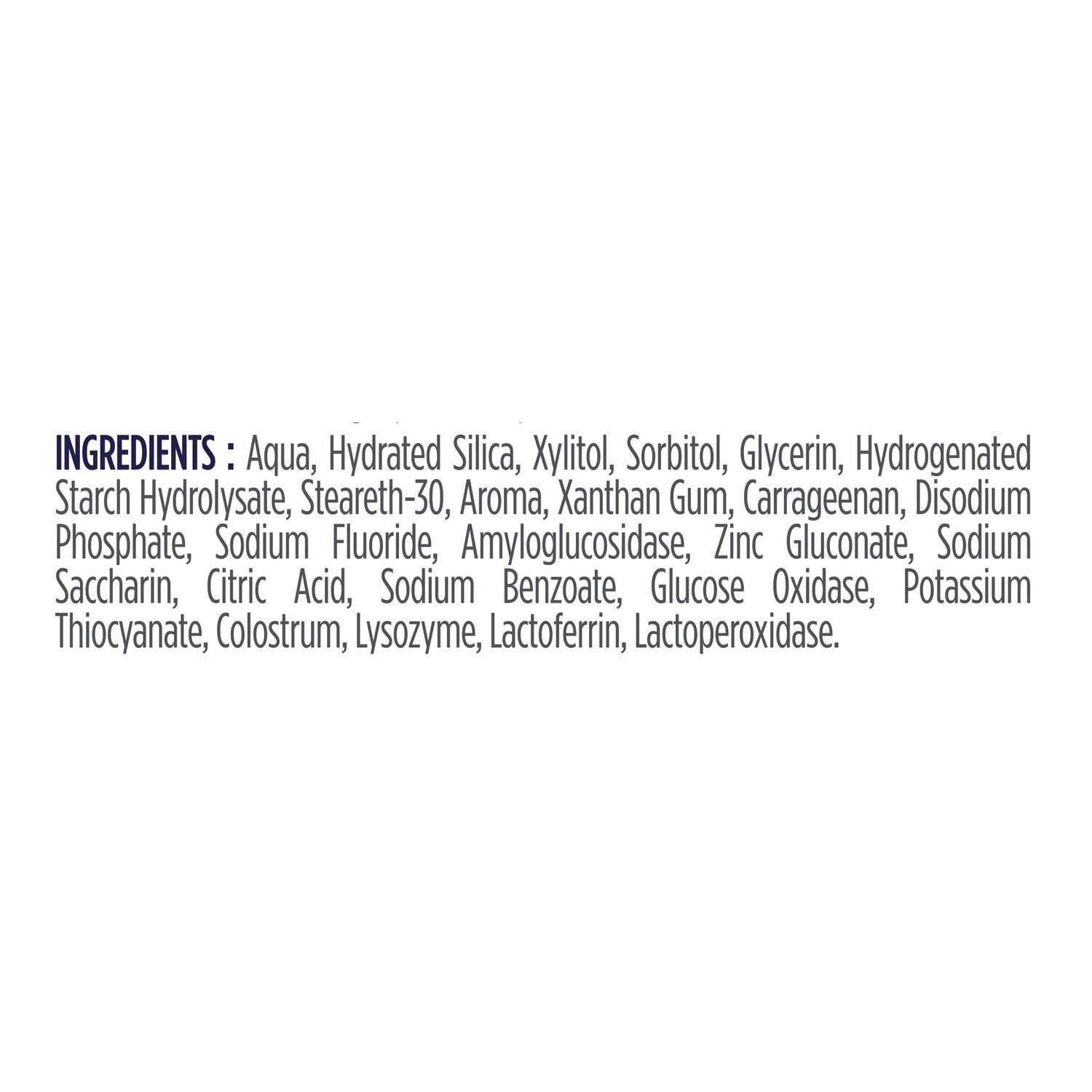 Ingredients: Aqua, Hydrated Silica, Xylitol, Sorbitol, Glycerin, Hydrogenated Starch Hydrolysate, Steareth-30, Aroma, Colostrum, Lysozyme, Lactoferrin, Lactoperoxidase.