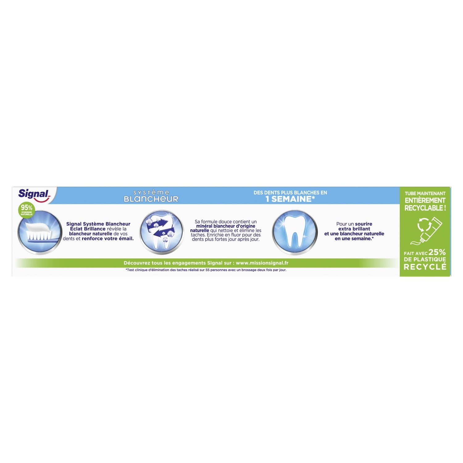 Signal Bright Whitening System toothpaste gives you an extra-bright smile and natural whiteness in one week*. With 95% naturally derived ingredients, its new gentle formula contains a naturally derived whitening mineral that cleans and removes stains. It is also enriched with fluoride for stronger teeth, day after day. Signal Bright Whitening System reveals the natural whiteness of your teeth and strengthens your enamel. In addition, the tube of this whitening toothpaste is fully recyclable and made with 25% recycled plastic. Its cardboard is also recyclable. For good oral health, Signal recommends brushing twice a day, a new toothbrush every three months, and a visit to the dentist twice a year. At Signal, we believe your smile is an expression of your personality and your self-confidence. Our mission: to improve oral health for everyone, so that each of us can unleash the power of our smile. Signal has been supporting the French since 1961, teaching them the right habits from a young age and demonstrating the importance of brushing twice a day, morning and evening. We take steps to limit the environmental impact of our products. With Signal, every smile counts! *Clinical stain removal test carried out on 55 people with twice-daily brushing.