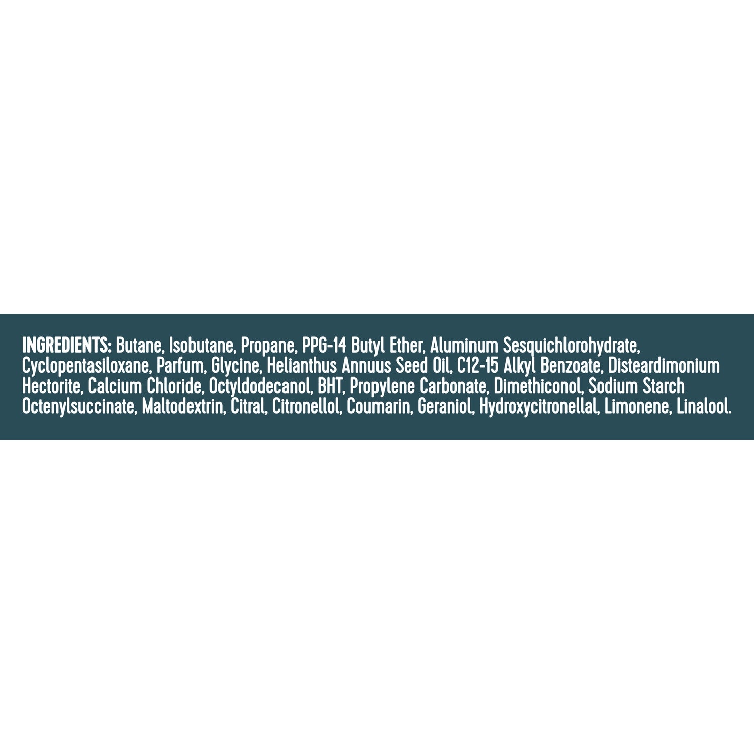 INGREDIENTS: Butane, Isobutane, Propane, Isohexadecane, PPG-14 Butyl Ether, Aluminum Sesquichlorohydrate, Parfum, Glycine, Helianthus Annuus Seed Oil, C12-15 Alkyl Benzoate, Disteardimonium Hectorite, Calcium Chloride, Octyldodecanol, Propylene Carbonate, BHT, Acetyl Cedrene, Amyl Salicylate, Anethole, Beta-Caryophyllene, Carvone, Citral, Citronellol, Coumarin, Geraniol, Geranyl Acetate, Hydroxycitronellal, Limonene, Linalool, Linalyl Acetate, Pinene, Tetramethyl Acetyloctahydronaphthalenes.