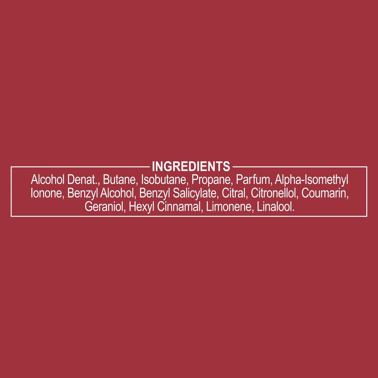 Ingredients: Alcohol Denat., Butane, Isobutane, Propane, Parfum, Alpha-Isomethyl Ionone, Benzyl Alcohol, Benzyl Salicylate, Citral, Citronellol, Coumarin, Geraniol, Hexyl Cinnamal, Limonene, Linalool.