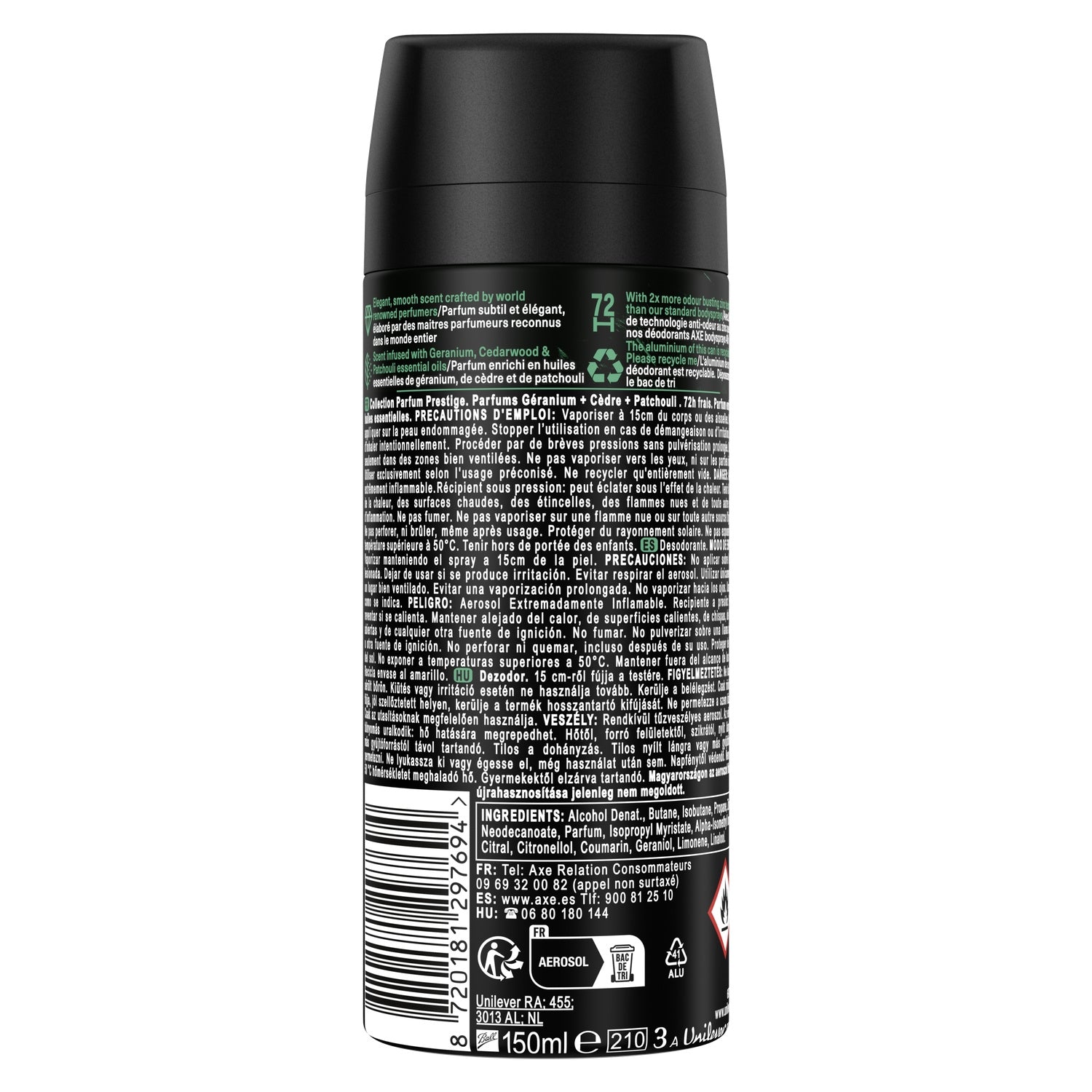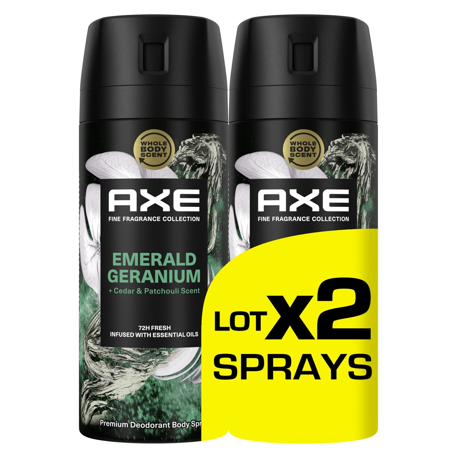 Discover AXE Emerald Geranium men's deodorant from our Prestige Perfume Collection range, in 2x150 ml format.,A men's deodorant with 2x more zinc anti-odor technology than in our AXE 48h bodyspray deodorants for high effectiveness and 72 hours of protection.,Prestige Perfume Collection: deodorant with a subtle and elegant scent of geranium, cedar and patchouli, developed by world-renowned master perfumers.,Shake, turn and spray the deodorant 15 cm from the body or underarms.,The packaging of this AXE men's deodorant contains at least 25% recycled aluminum and is mostly recyclable. Put me in the recycling bin!,With AXE Emerald Geranium deodorant, stay confident all day long!