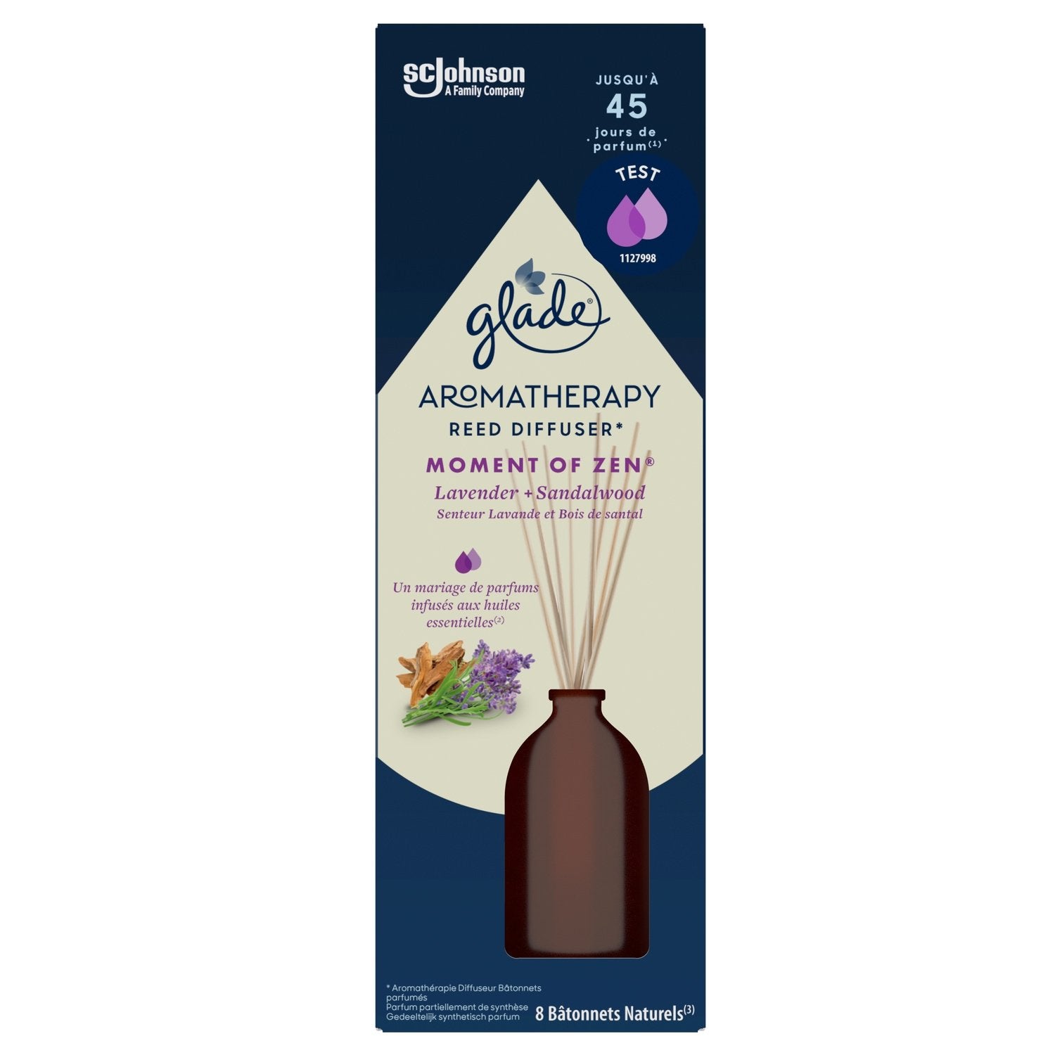 AROMATHERAPY STICKS: Gently scent every room in your home continuously with Glade® Aromatherapy Reed Diffuser Sticks.,EFFECTIVENESS & BENEFITS: Our Glade® Aromatherapy Reed Diffuser Sticks use the benefits of aromatherapy to accompany you every day with fragrances infused with traceable essential oils.,They blend perfectly into your home to become a true interior decoration object.,FRAGRANCE: Take a moment for yourself and enjoy the sweetness of the Moment of Zen® fragrance; a wise combination of the essential oil duo of French Lavandin and Australian Sandalwood.,FORMULATION: Formulated without parabens, phthalates, nitrated musk or artificial colors.,PACK COMPOSITION: The pack consists of a diffuser and its 8 sticks. The packaging is made of FSC® certified recycled cardboard. Partially synthetic fragrance.