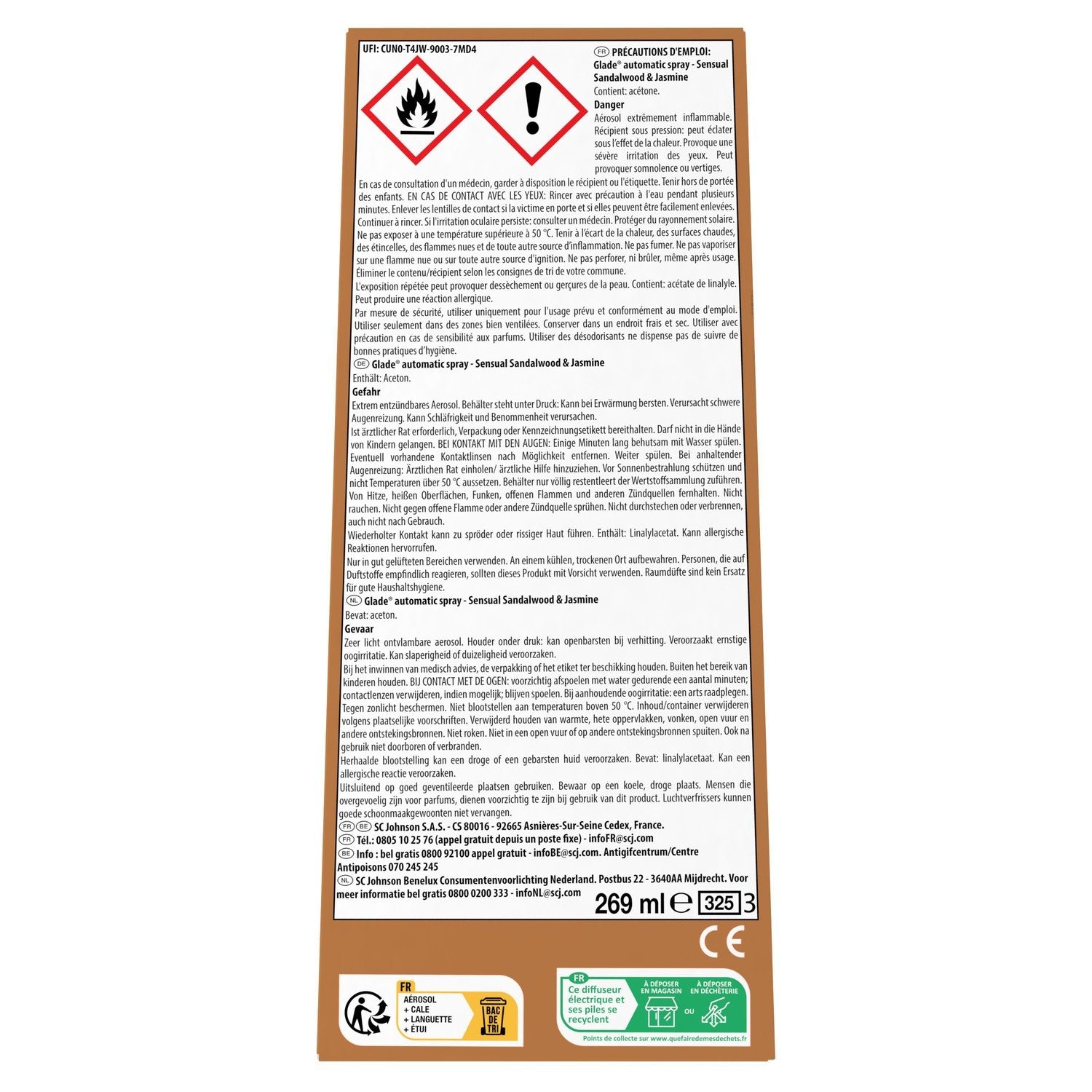 AUTOMATIC SPRAYS: Enjoy instant fresh fragrance throughout your day with the Glade® Automatic Diffuser and its personalized programming every 9, 18 or 36 minutes.,FRAGRANCE: Capture the warm essence of a spa day with notes of jasmine and sandalwood carefully intertwined with amber and bergamot for a moment of pure comfort with our Sensual Sandalwood & Jasmine fragrance infused with essential oils.,FORMULATION: Formulated without phthalates, parabens or formaldehydes.,PACK COMPOSITION: The pack consists of a Glade® Automatic Diffuser and its Sensual Sandalwood & Jasmine refill.,Dangerous, Follow the precautions for use.,Partially synthetic fragrance.