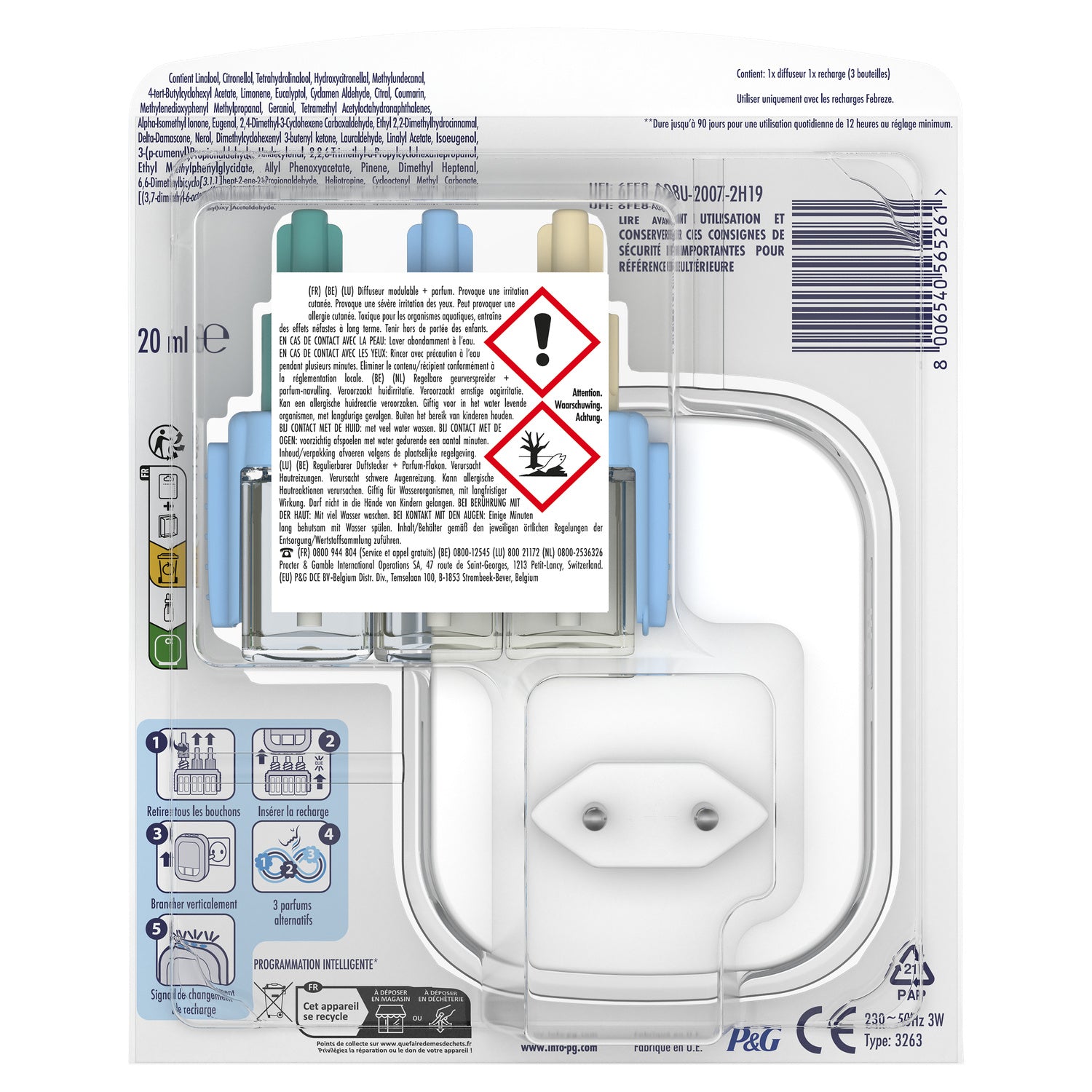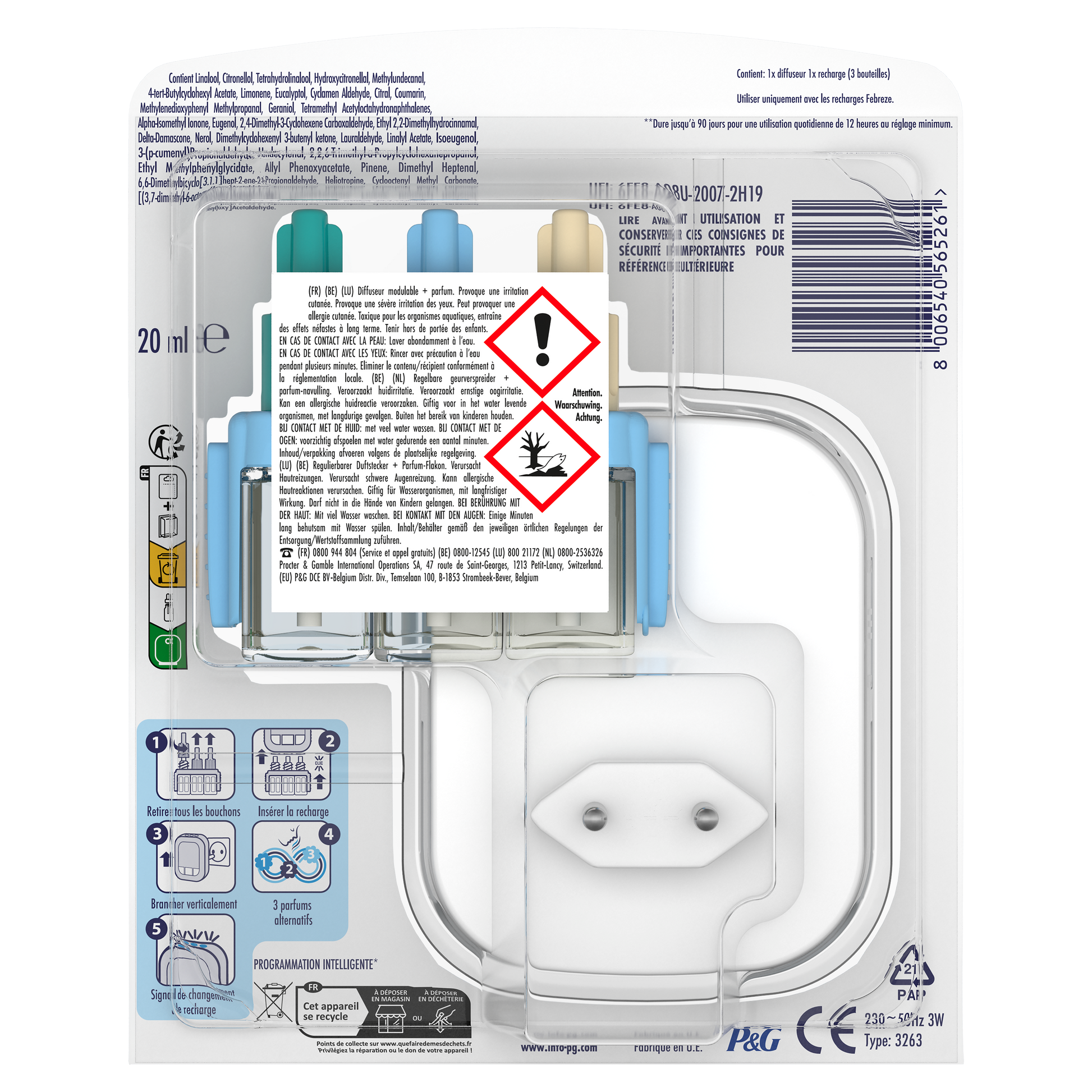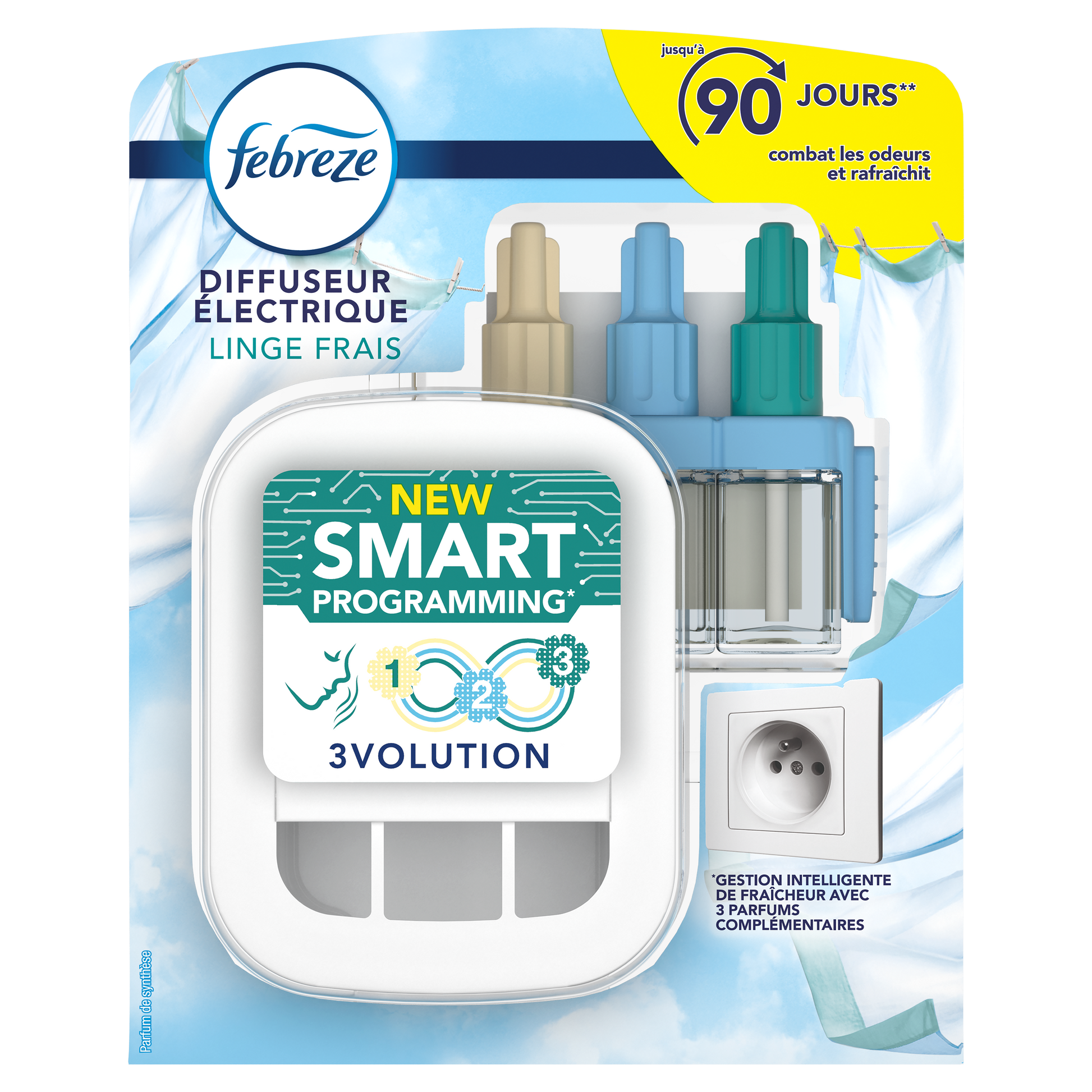 Febreze 3Volution Smart Programming Fresh Linen continuously fights odors and cycles through 3 complementary scents for long-lasting freshness. Lasts up to 90 days (used for 12 hours per day on minimum setting). Discover the beauty of Fresh Linen, now with digitally controlled scent alternation. Fresh scent that diffuses further to fill your home with a lovely fragrance. Fresh Linen is inspired by fresh flowers. Let a sense of calm wash over you as this sweet, fresh scent fills the air. Let calm envelop you as this sweet, healthy scent fills the air. With traditional diffusers, we quickly get used to the scents being diffused and eventually stop smelling them. Febreze 3Volution air fresheners renew the freshness by automatically switching between 3 complementary, high-quality scents every 45 minutes. Use Febreze 3Volution refills with the 3Volution electric diffuser to fill your home with freshness and fragrance that lasts day after day, week after week. With 3Volution, you can adjust the fragrance intensity level and create the right ambiance whenever you want.