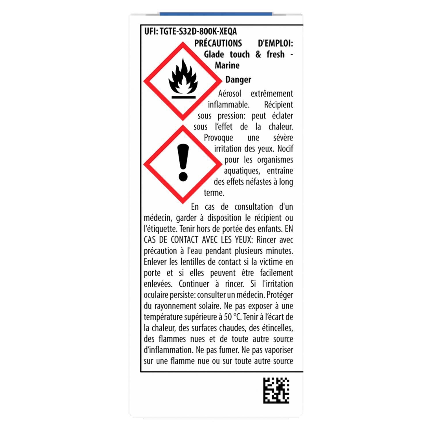 TOUCH & FRESH: Enjoy an instant fresh scent with Glade® Touch & Fresh refills, designed to combat the toughest odors with a concentrated formula that leaves no wet residue.,EFFECTIVENESS & BENEFITS: Our Touch & Fresh diffusers are guaranteed TrueScent Technology™ to ensure a long-lasting feeling of cleanliness thanks to an exclusive blend of ingredients., Their formula provides 2x more freshness than classic Glade® aerosols. They blend perfectly with the decor of your toilets and bathrooms.,FRAGRANCE: Experience adventure for a moment thanks to the ocean notes of this fragrance formulated with marine essences. It will give you the feeling of a trip to the seaside of your favorite destination.,FORMULATION: Formulated without phthalates, parabens or formaldehydes.,COMPOSITION OF THE PACK: The pack consists of a Fresh Lemon refill.,Dangerous. Follow the precautions for use. Partially synthetic fragrance.