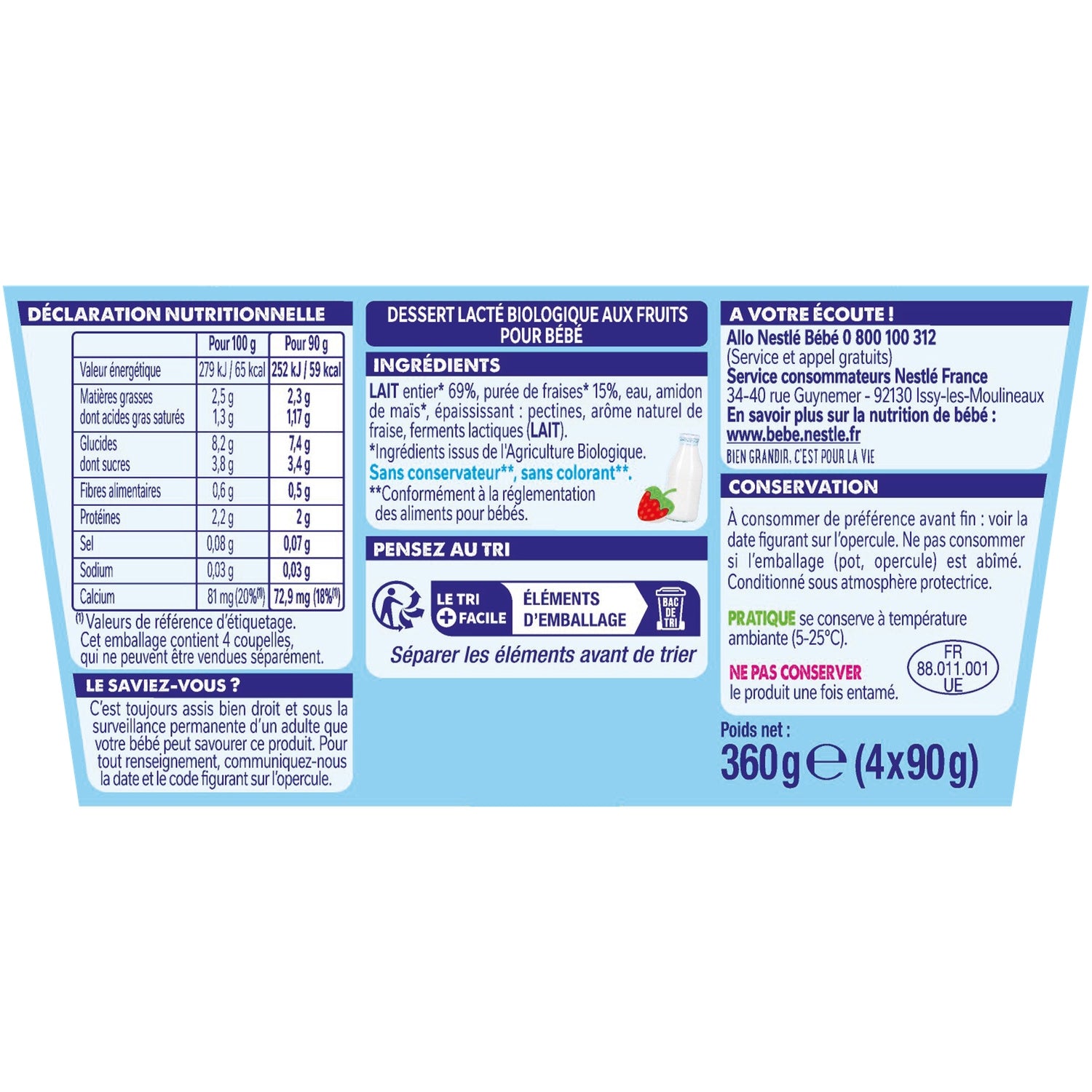 Ingredients from organic farming that help respect the environment and biodiversity.,No coloring*, no preservatives*.,Source of calcium.,No added sugar**,*In accordance with baby food regulations.,**Contains naturally occurring sugars.