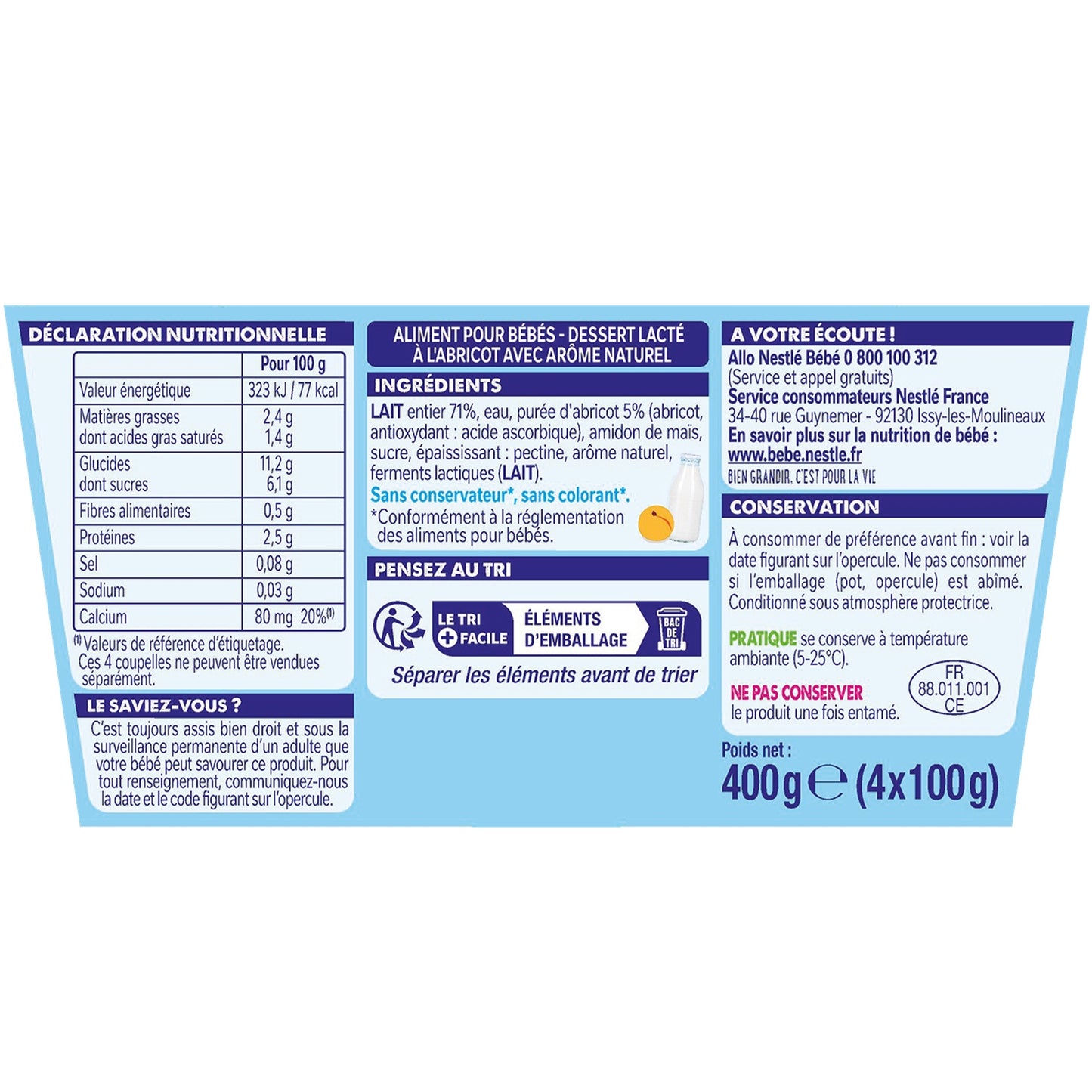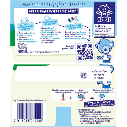 -50% minimum sugars**.**-55% compared to the average dessert creams in the fresh produce section - Ciqual 2020.,Source of calcium.,No coloring**, no preservatives**.,With an adjusted protein content**.,Produced in the Vosges with French milk.,* -40% sugars compared to the average yogurts, fermented milks or dairy specialties, with fruit, sweetened in the fresh produce section - Ciqual 2020 **In accordance with baby food regulations.Apricot from the EU.
