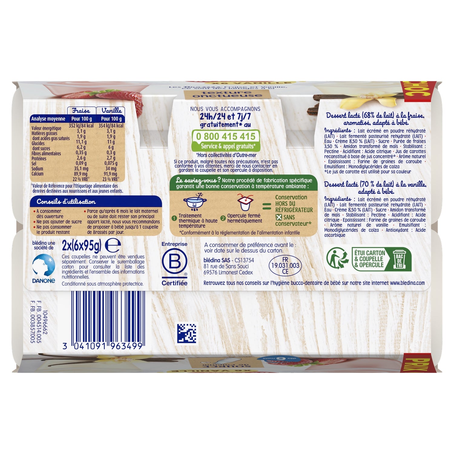 BLEDINA Les Brassés Fraise Ingredients: Rehydrated skimmed milk powder (MILK) - Rehydrated pasteurized fermented milk (MILK) - Water - Cream 8.50% (MILK) - Sugar - Strawberry puree 3.50% - Transformed corn starch - Stabilizer: Pectin - Acidifier: Citric acid - Reconstituted carrot juice from concentrated juice* - Natural flavoring - Thickener: Carob bean flour - Emulsifier: Rapeseed monodiglycerides. *Carrot juice is used for its color BLEDINA Les Brassés Vanille Ingredients: Rehydrated skimmed milk powder (MILK) - Rehydrated pasteurized fermented MILK (MILK) - Water - Cream 8.50% (MILK) - Sugar - Transformed corn starch - Stabilizer: Pectin - Acidifier: Citric acid - Thickener: Carob bean flour - Natural vanilla flavoring - Emulsifier: Rapeseed monodiglycerides - Antioxidant: Ascorbic acid