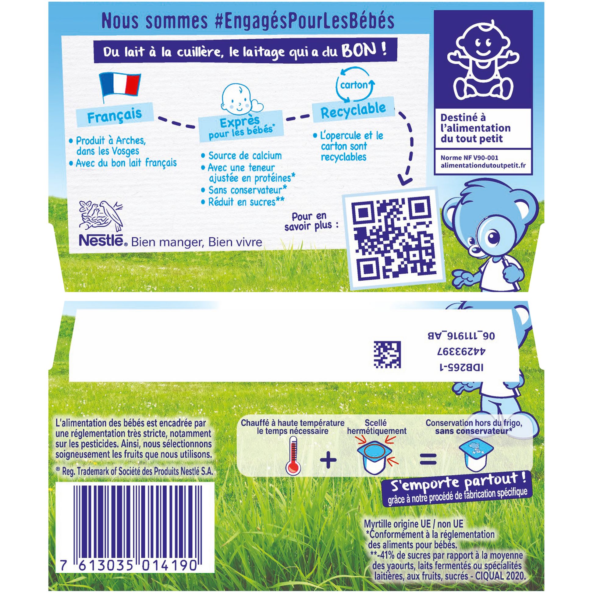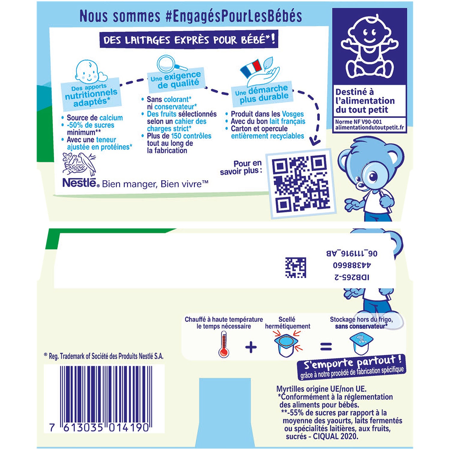-50% minimum sugars**.**-55% compared to the average dessert creams in the fresh produce section - Ciqual 2020.,Source of calcium.,No coloring**, no preservatives**.,With an adjusted protein content**.,Produced in the Vosges with French milk.,* -40% sugars compared to the average yogurts, fermented milks or dairy specialties, with fruit, sweetened in the fresh produce section - Ciqual 2020 **In accordance with baby food regulations.Blueberry from the EU.