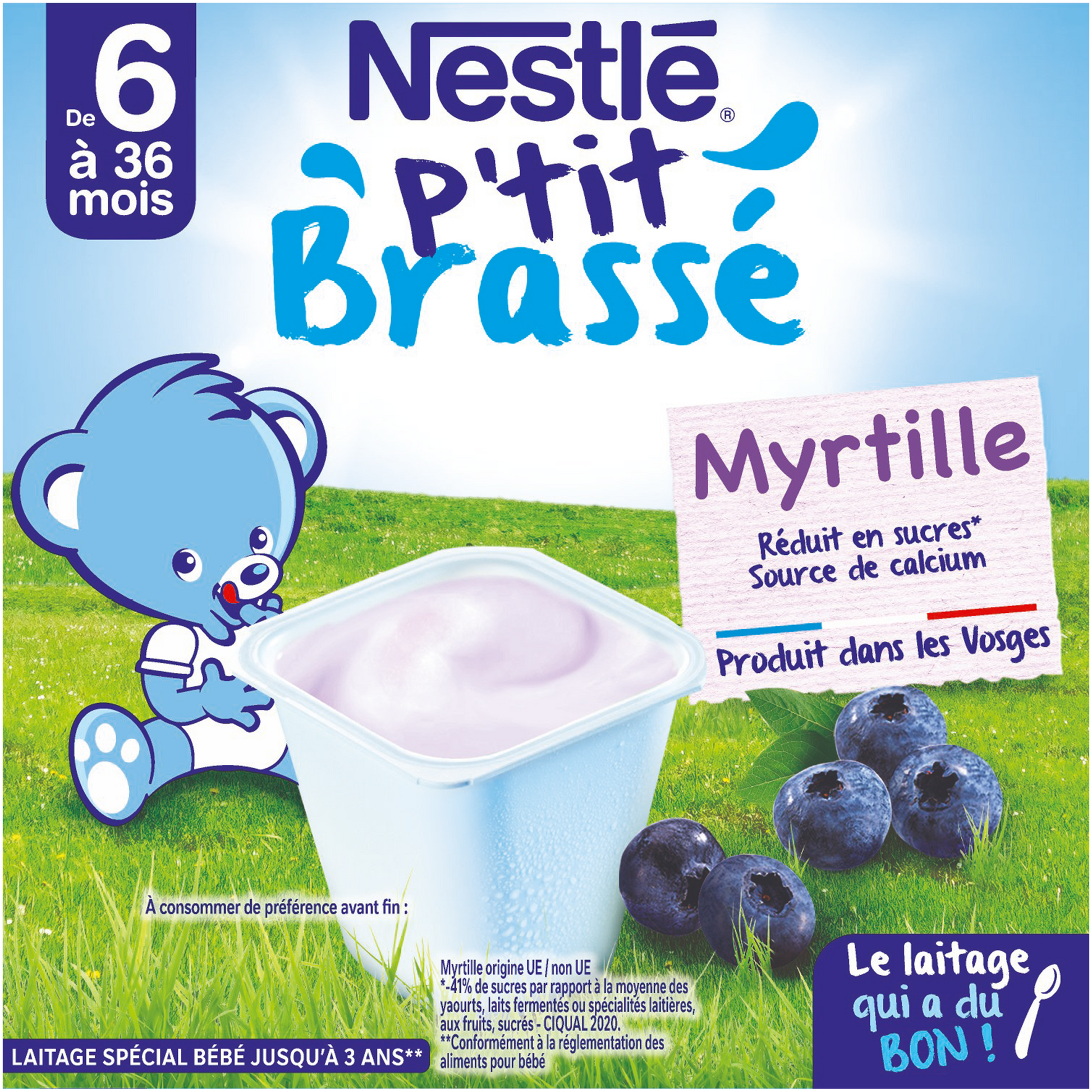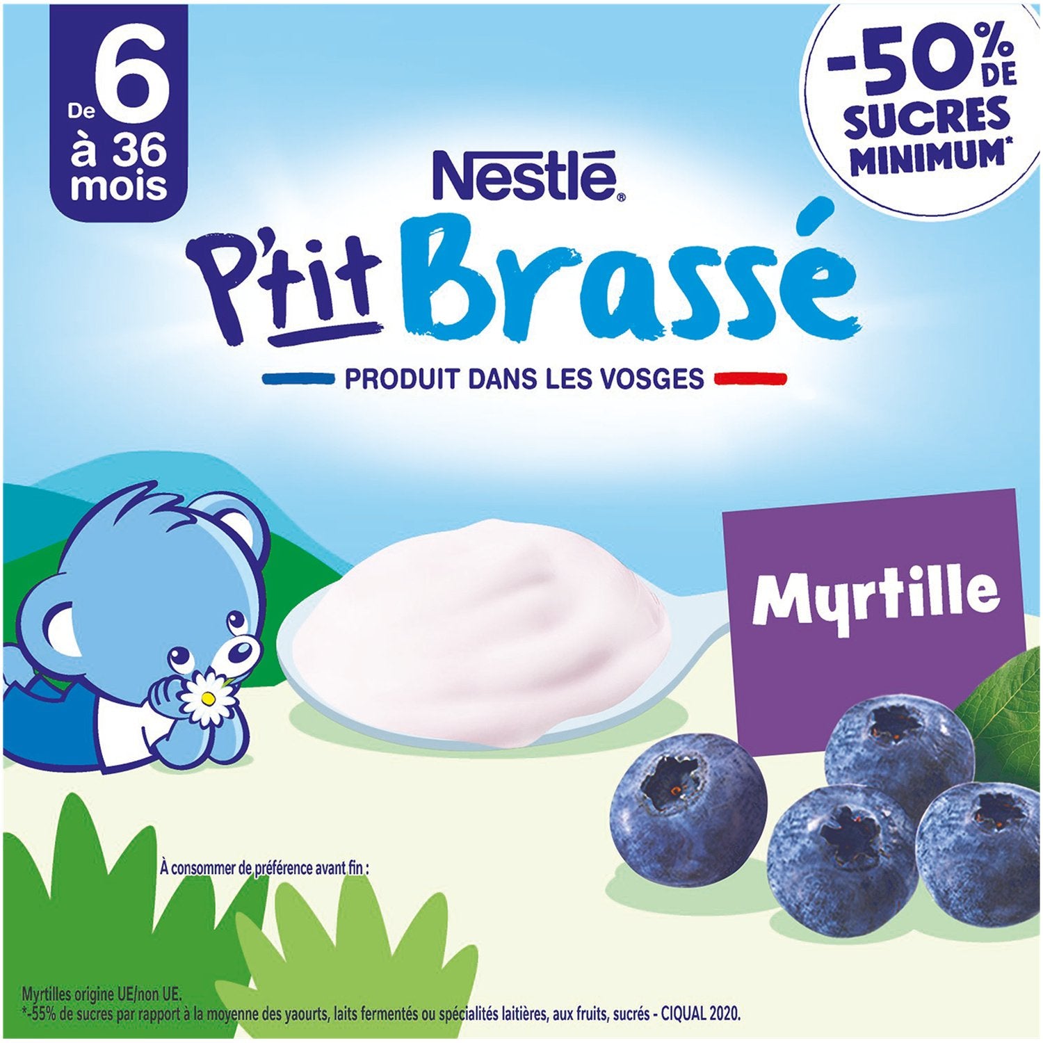 P'tit Brassé à la Myrtille, the dairy product designed especially for babies* -50% minimum sugars**. Produced in the Vosges. This delicious dairy product for babies from 6 months old can be served as a snack or dessert. Practical for parents, this little jar designed for babies can go everywhere with you because until it is opened, it can be stored at room temperature and not in the refrigerator.*In accordance with baby food regulations. **- 55% Compared to the average for yogurts, fermented milks or fruit-based dairy specialties, sweetened - Ciqual 2020. Blueberry from EU/non-EU origin.