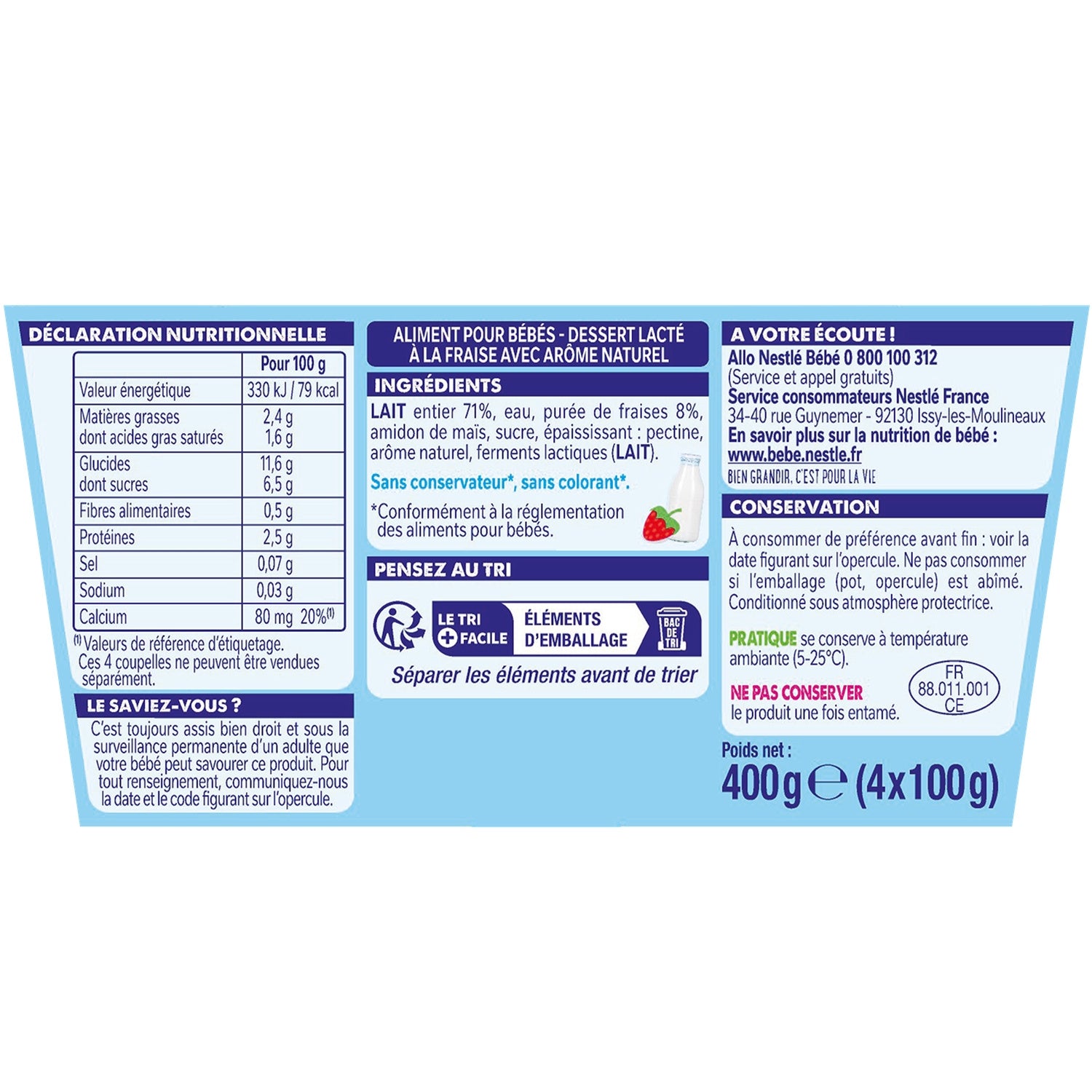 -50% minimum sugars**.**-52% compared to the average dessert creams in the fresh produce section - Ciqual 2020.,Source of calcium.,No coloring**, no preservatives**.,With an adjusted protein content**.,Produced in the Vosges with French milk.,* -40% sugars compared to the average yogurts, fermented milks or dairy specialties, with fruit, sweetened in the fresh produce section - Ciqual 2020 **In accordance with baby food regulations.Strawberry from the EU.