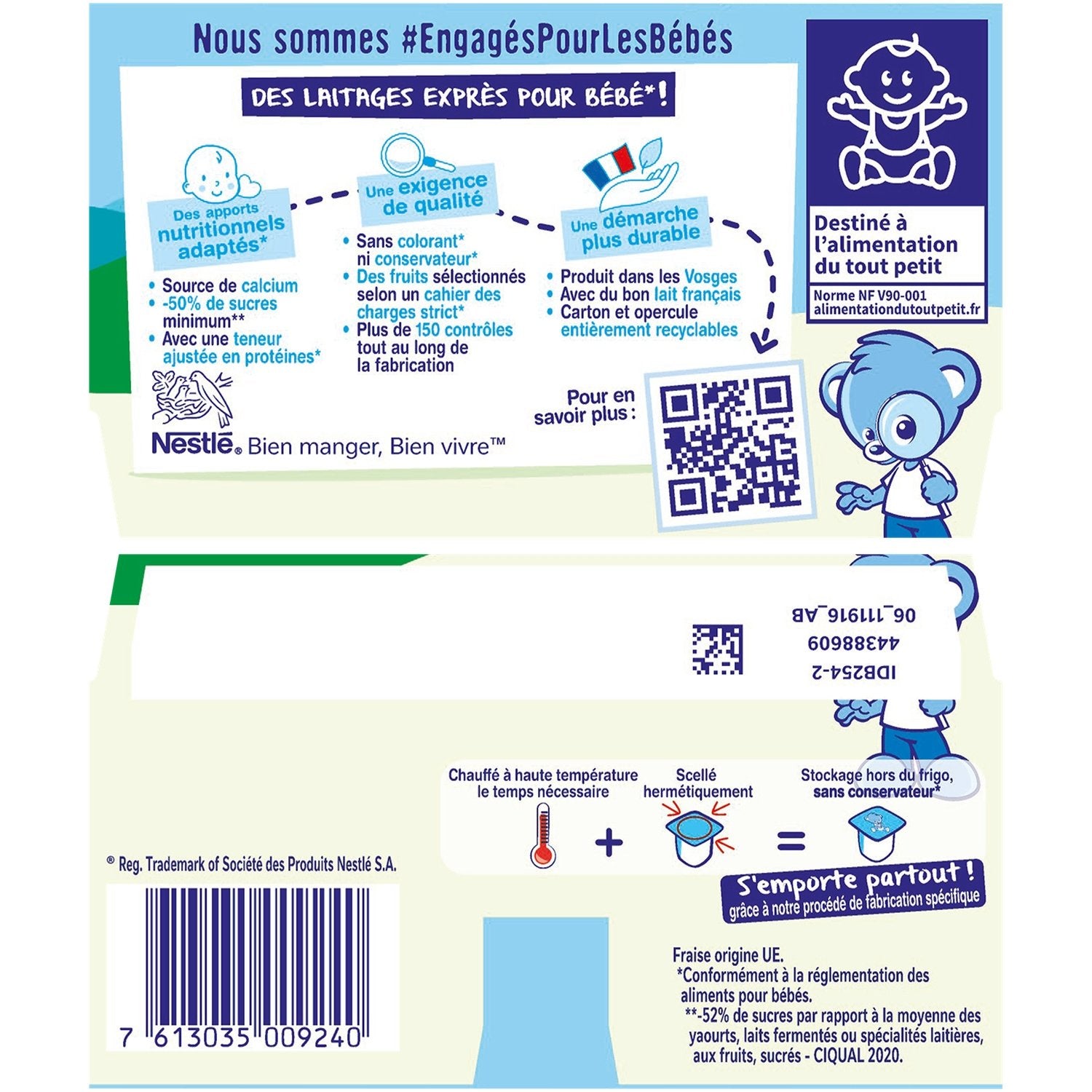 Reduced in sugars*, Source of calcium, No coloring**, no preservatives**, With an adjusted protein content**, * -40% sugars compared to the average yogurt, fermented milk or dairy specialties, with fruit, sweetened in the fresh section - Ciqual 2020 **In accordance with the regulations on baby food.