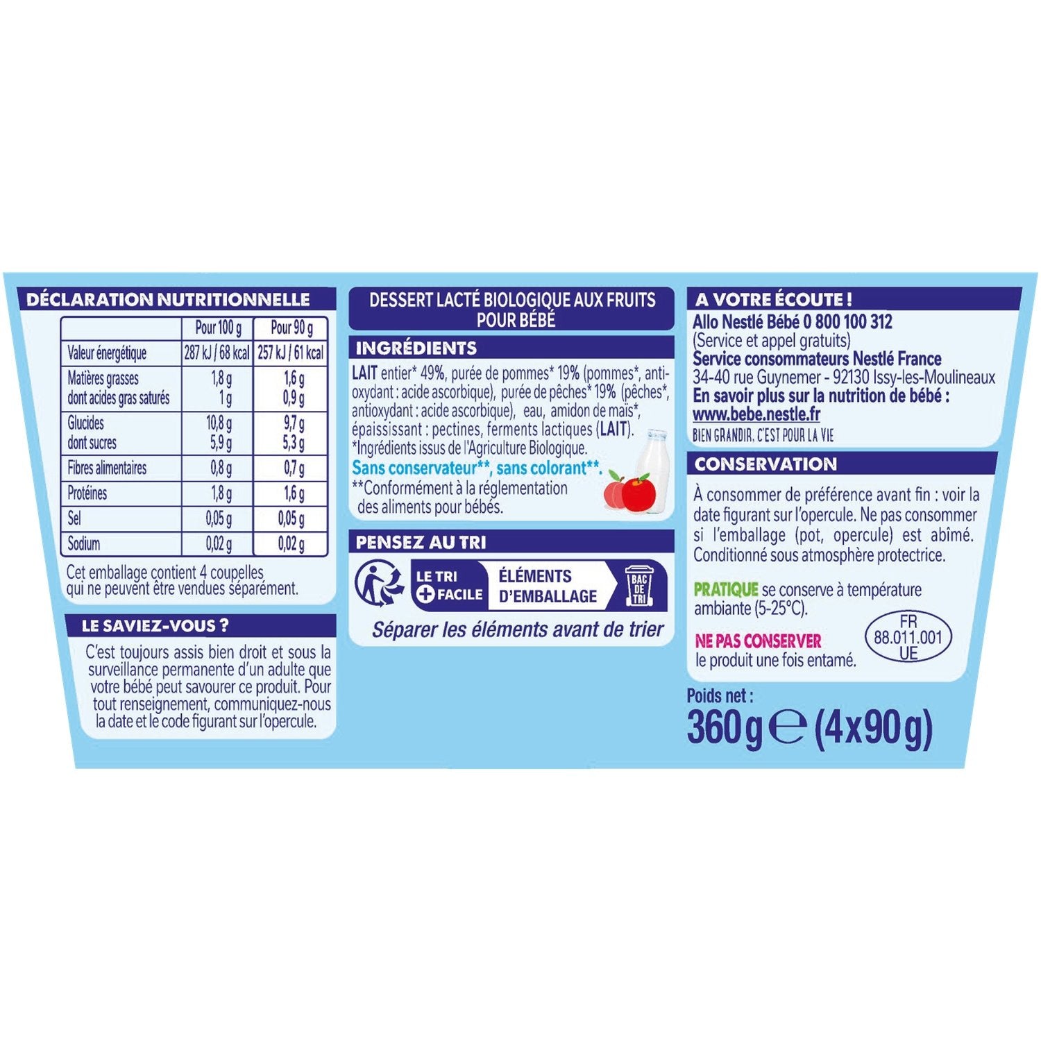 Ingredients: Whole MILK* 49%, apple puree* 19% (apples*, antioxidant: ascorbic acid), peach puree* 19% (peaches*, antioxidant: ascorbic acid), water, corn starch*, thickener: pectins, lactic ferments (MILK). *Ingredients: from Organic Farming