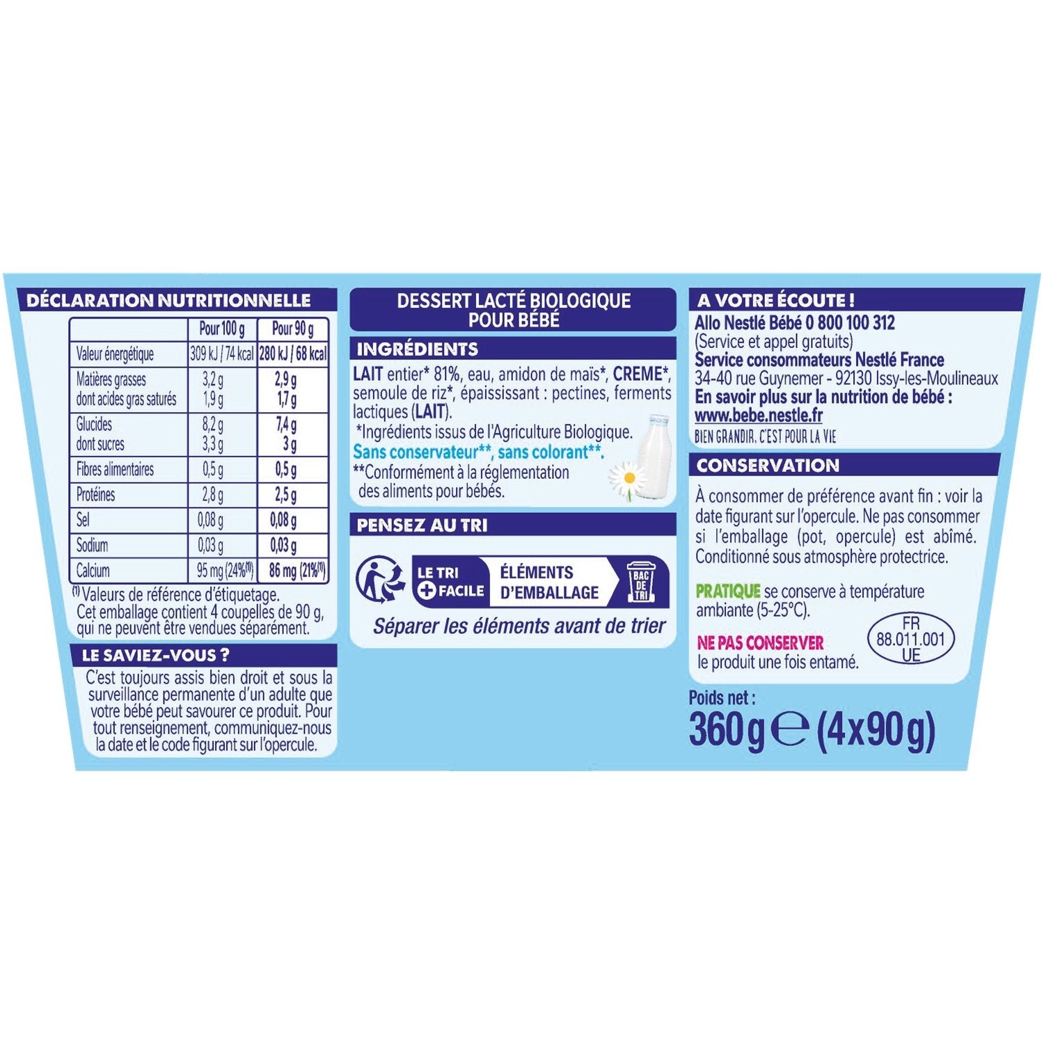 Ingredients: Whole MILK* 81%, water, corn starch*, CREAM*, rice semolina*, thickener: pectins, lactic ferments (MILK). *Ingredients: from Organic Farming