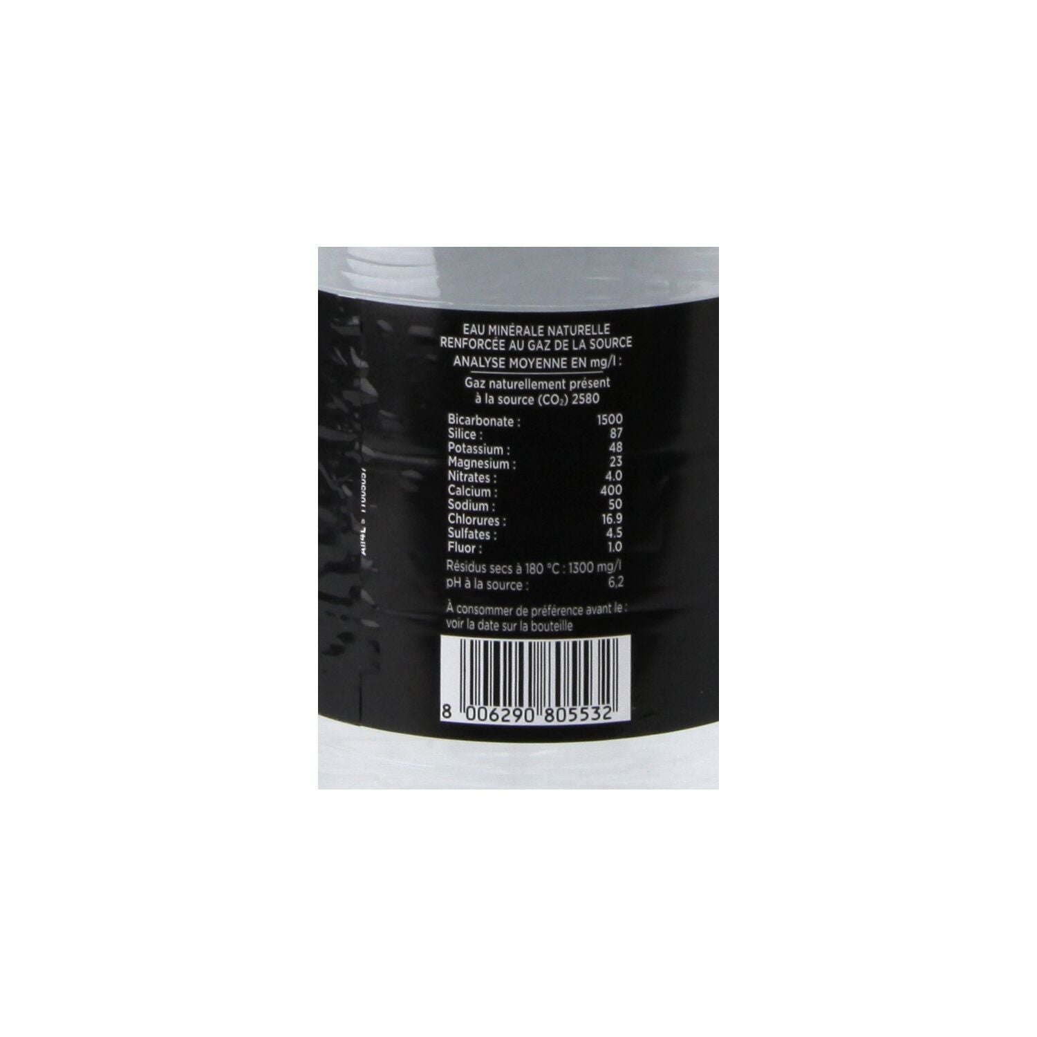 Mineralization characteristics (mg/l): bicarbonate: 1500. Silica: 87. Potassium: 48. Magnesium: 23. Nitrates: 4.0. Calcium: 400. Sodium: 50. Chlorides: 16.9. Sulfates: 4.5. Fluorine: 1.0. Dry residue at 180°C: 1300 mg/l pH at source: 6.2. Gas naturally present at source (CO2) 2580.