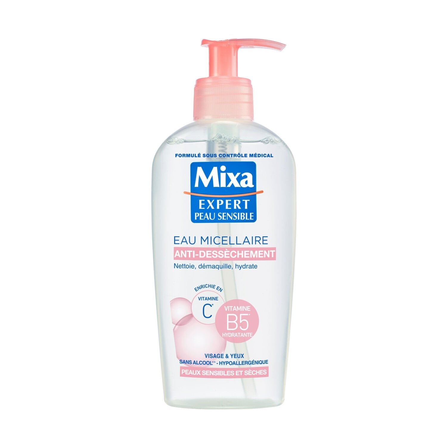 Mixa Vitamin Micellar Water gently cleanses sensitive and dry skin. Its formula captures and removes makeup, impurities, and pollution particles from the face and eyes in a single step. A gentle, non-drying cleansing and makeup removal action for sensitive and dry skin. The skin is intensely rehydrated, and the complexion appears fresher.