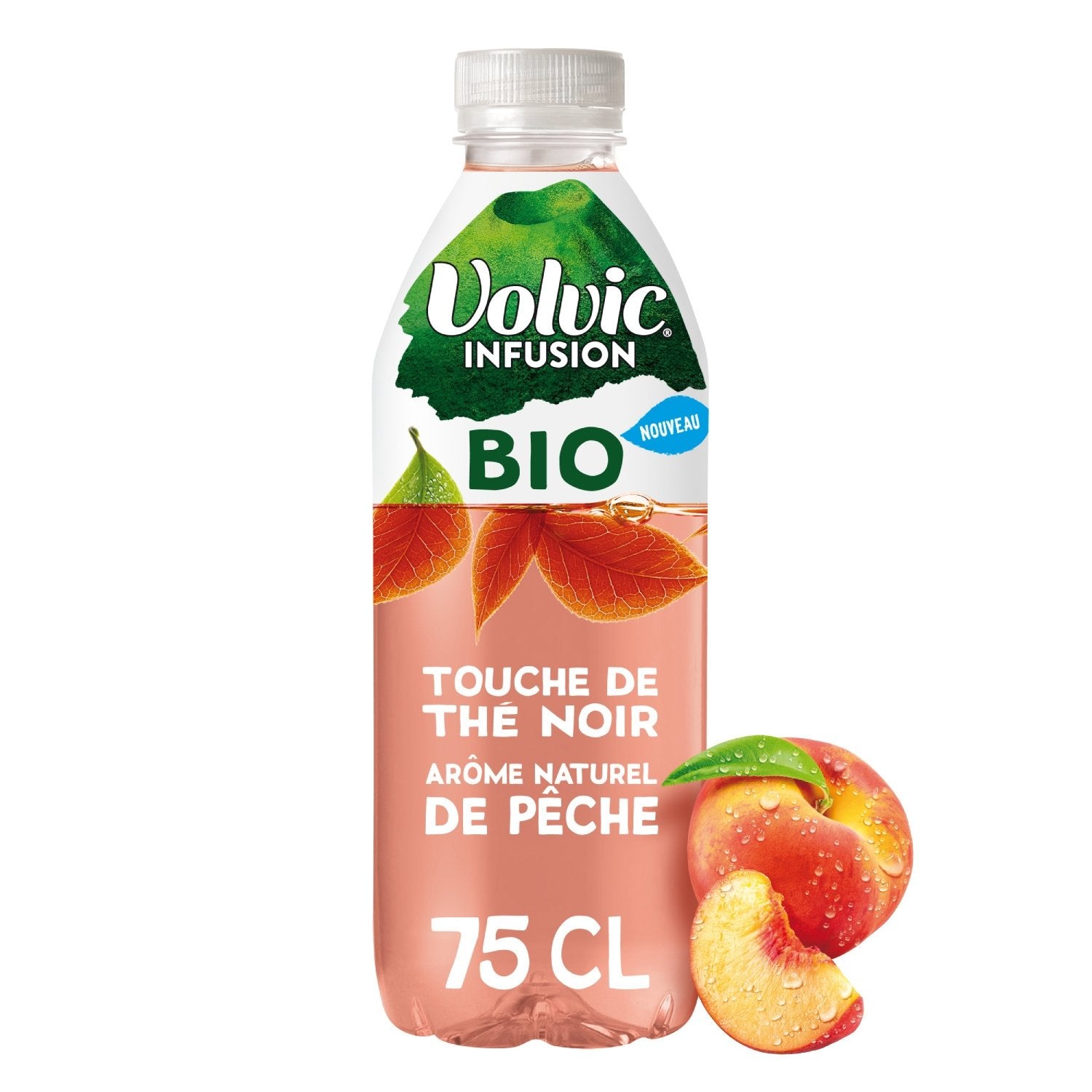 Volvic Infusion Bio, a range inspired by the world's volcanoes. A drink combining Volvic natural mineral water with delicate infusions. The majestic Mount Etna and its surrounding aromas inspired this recipe: Volvic natural mineral water combined with an infusion of organic black tea and delicate peach flavors. An original sensory experience that will take your taste buds on a journey around the world.