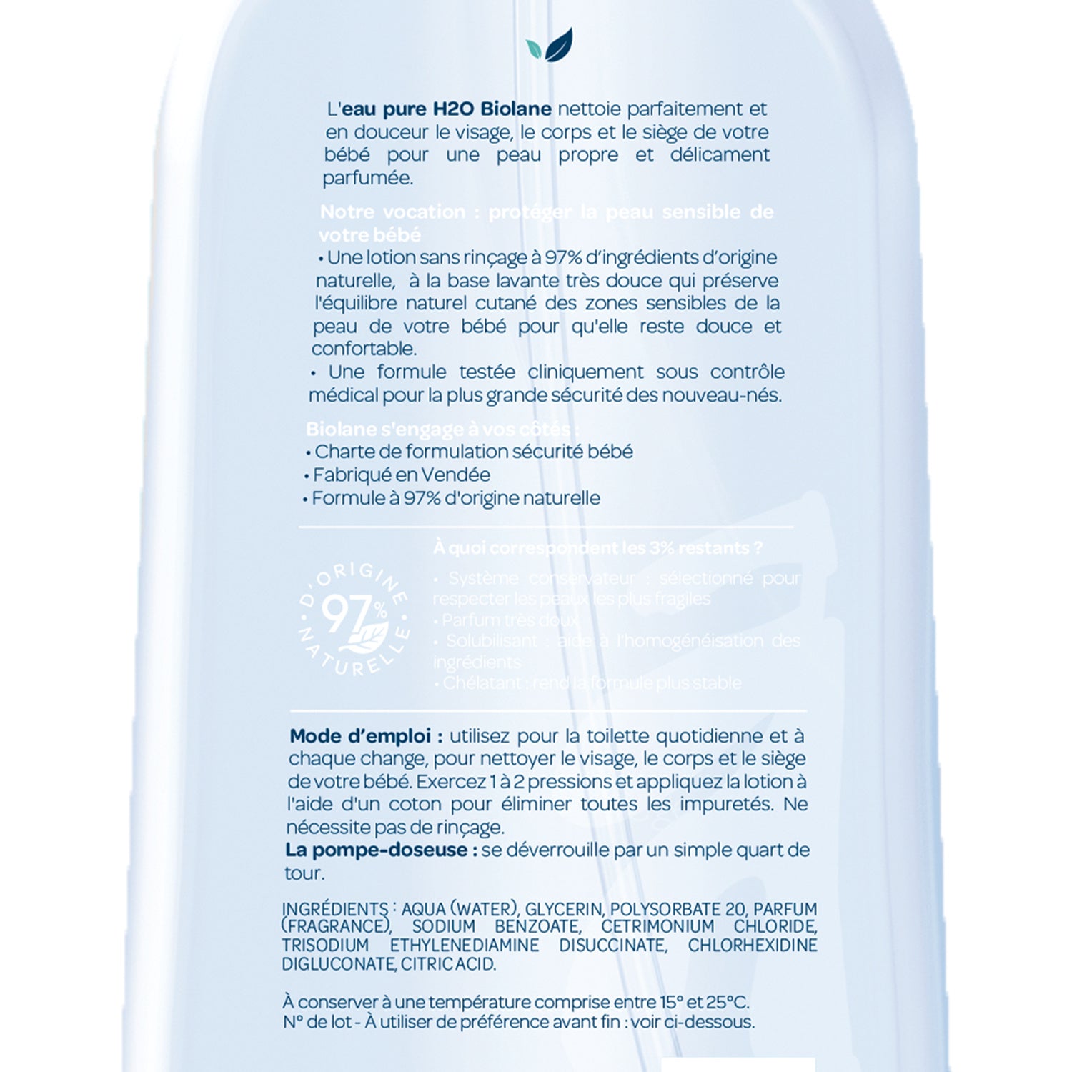 Biolane H2O pure water perfectly and gently cleanses your baby's face, body and bottom for clean and delicately scented skin. A 'one-handed' dosing pump: it delivers the product directly onto the cotton pad with a simple press and allows you to always keep one hand on your baby for their greatest safety. Our vocation: to protect your baby's sensitive skin. A lotion with 97% ingredients of natural origin, with a very gentle cleansing base that preserves the natural skin balance of sensitive areas of your baby's skin to keep it soft and comfortable. A formula clinically tested under medical supervision for the greatest safety of newborns. Our commitment: to participate in a sustainable future. An eco-refill, containing 84% less plastic than a classic bottle of Biolane H2O pure water 750ml. French manufacturing that promotes local employment.
