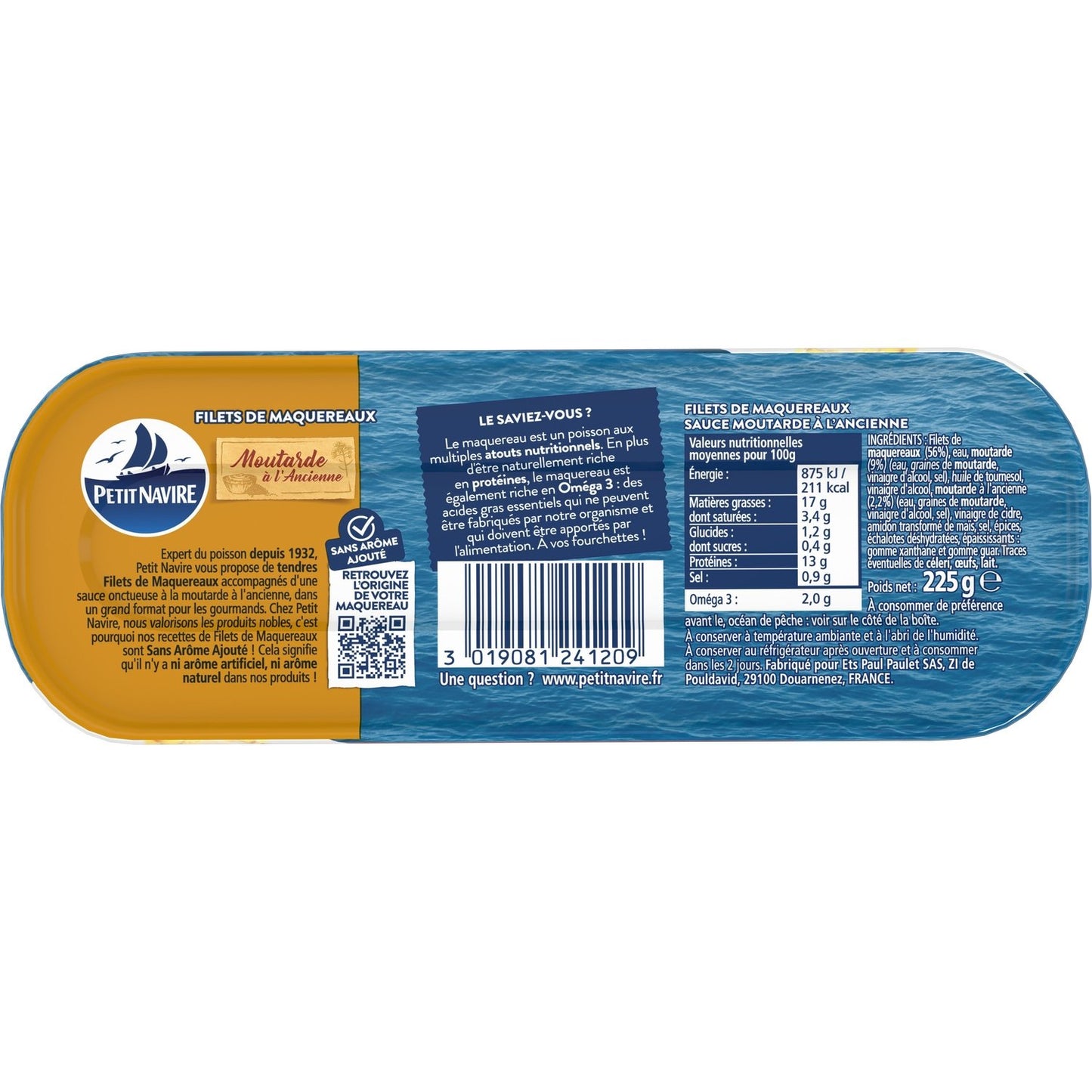 MACKEREL fillets (56%), water, spirit vinegar, MUSTARD (6.9%) (water, MUSTARD seeds, spirit vinegar, salt), sunflower oil, old-fashioned MUSTARD (3.5%) (water, MUSTARD seeds, spirit vinegar, salt), sugar, processed corn starch, salt, thickeners: xanthan gum and guar gum, spice, (including CELERY).