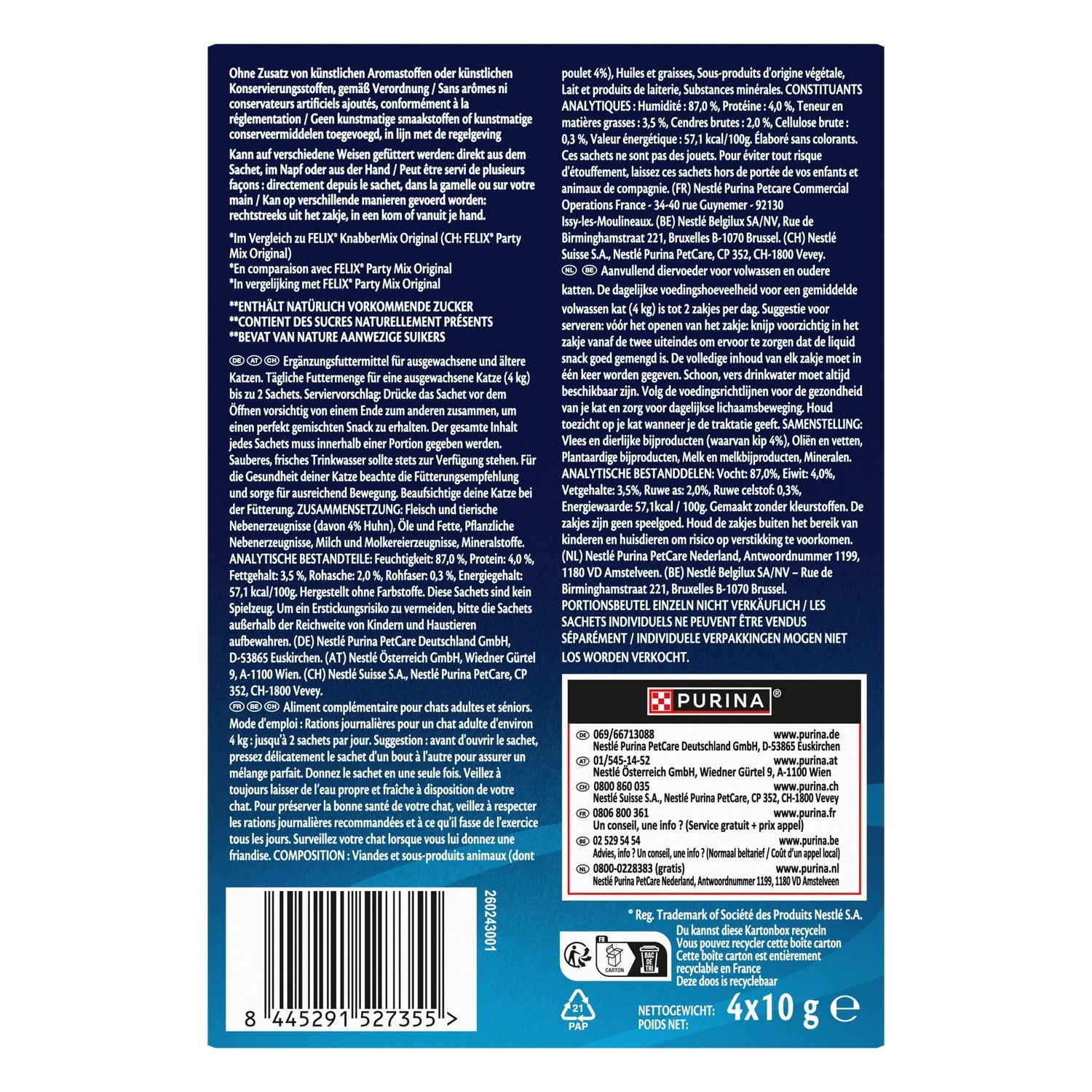 With chicken, Made without artificial colors, Low in calories* *Compared to Felix® Party Mix Original, No added sugars** **Contains naturally occurring sugars, Irresistible tasting cat treat, A lickable treat, designed to be hand-fed to your cat, for moments of bonding