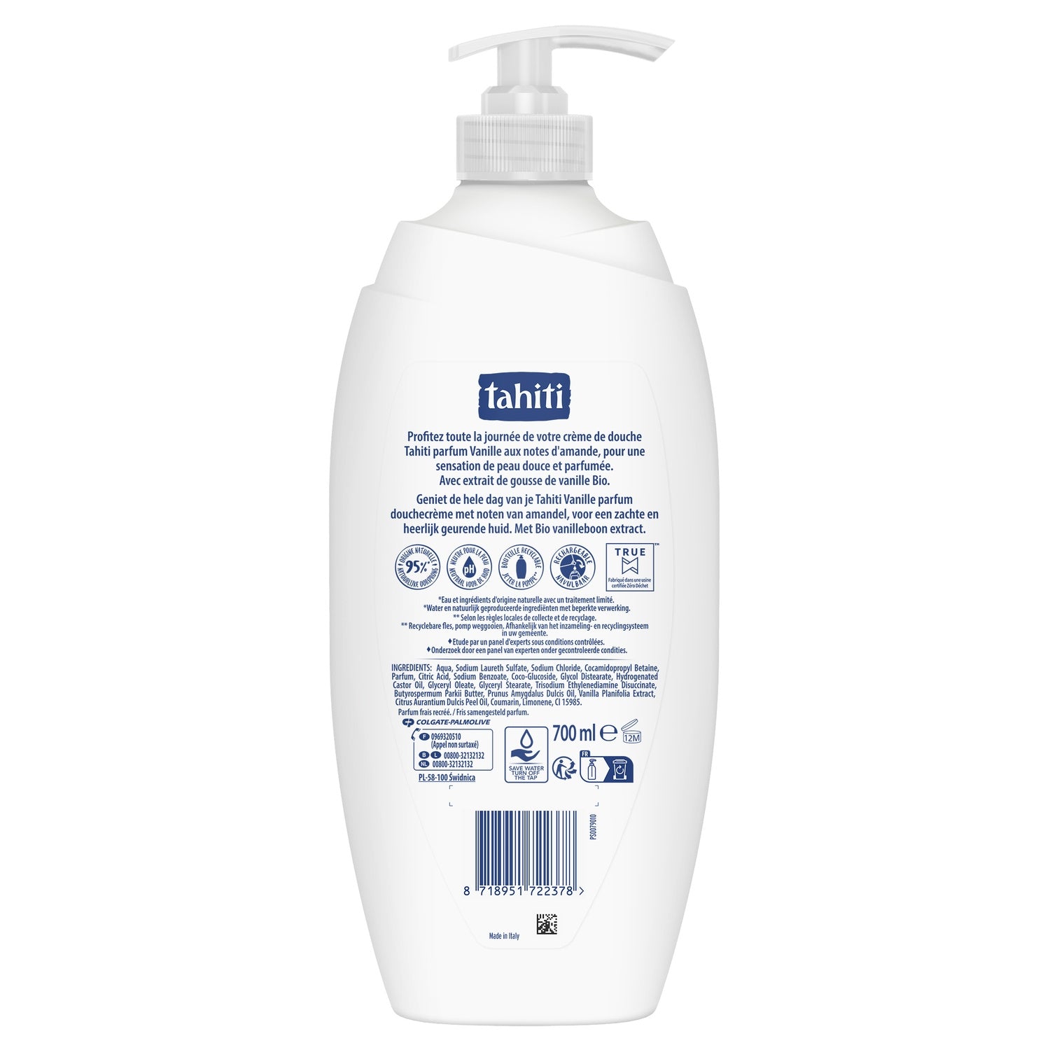 8H OF FRAGRANCE: Enjoy fragrant skin all day long.,A FORMULATION WITH INGREDIENTS OF NATURAL ORIGIN*: A formula with 95%* of ingredients of natural origin packaged in France. *Water and ingredients of natural origin with limited processing.,PH NEUTRAL FOR SKIN: A gentle and respectful formula that preserves the natural balance of your skin.,INSTRUCTIONS FOR USE: Tahiti shower gel can be used daily, in the shower, according to your habits. In case of skin irritation, discontinue use. In case of contact with eyes, rinse thoroughly with clean water.