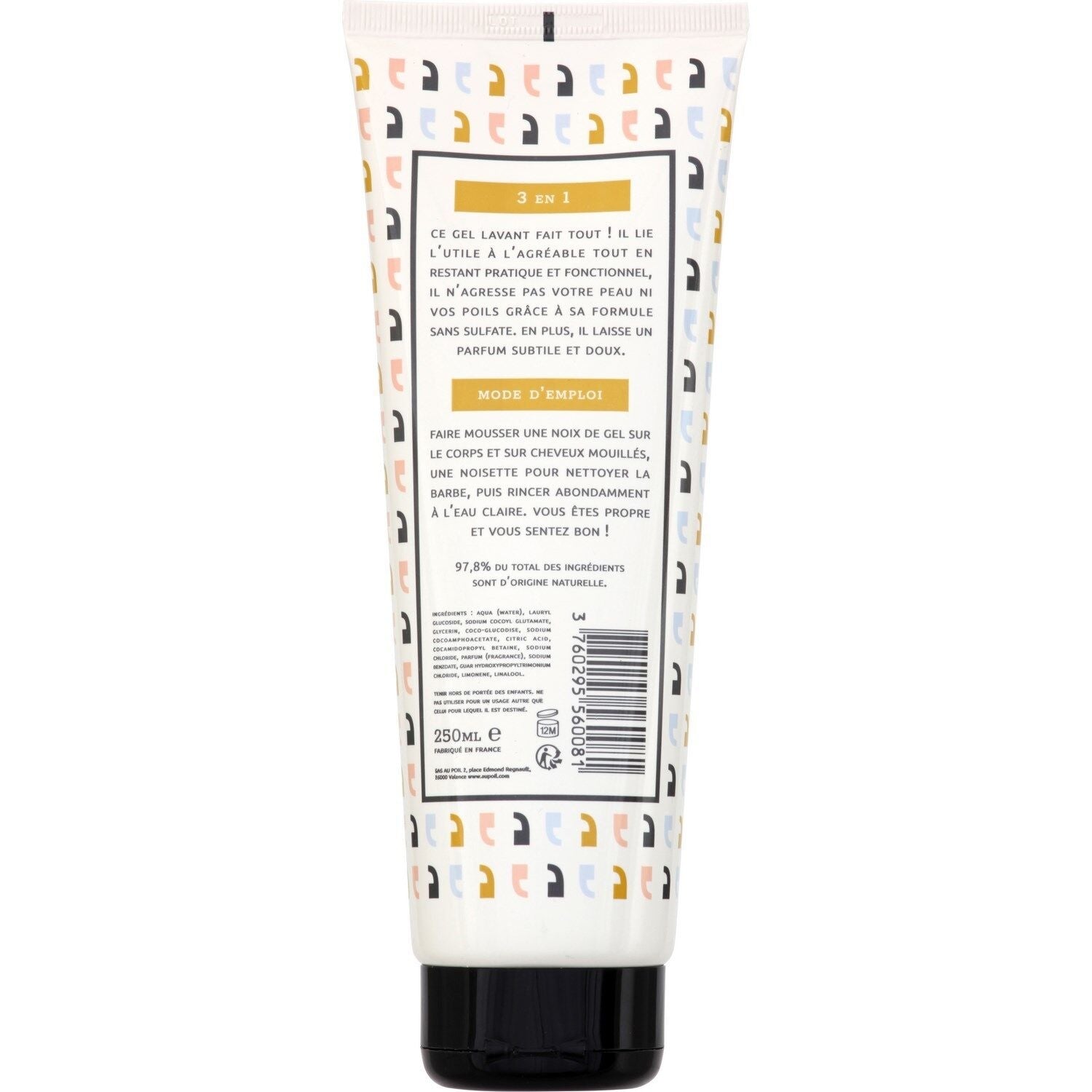 Lather a small amount of gel on your body and wet hair, a small amount to clean your beard, then rinse thoroughly with clean water. You're clean and smelling good!