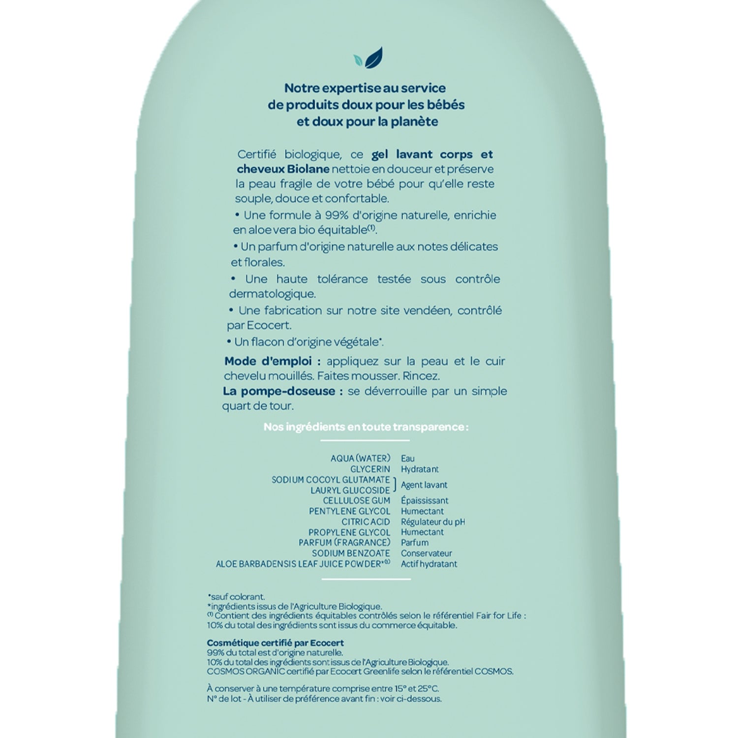 Organic Cosmetics - Cosmebio Charter Body and hair washing gel Cleanses and protects Very gentle Does not sting the eyes COSMOS ORGANIC Made in France Vegetable bottle Clinically tested