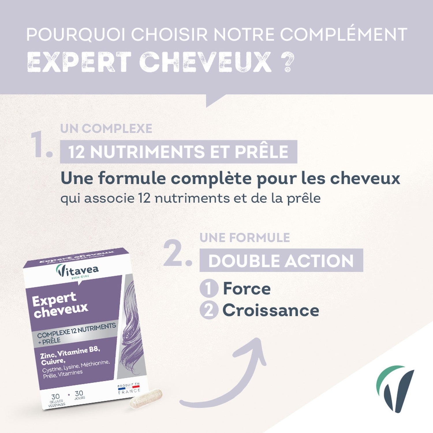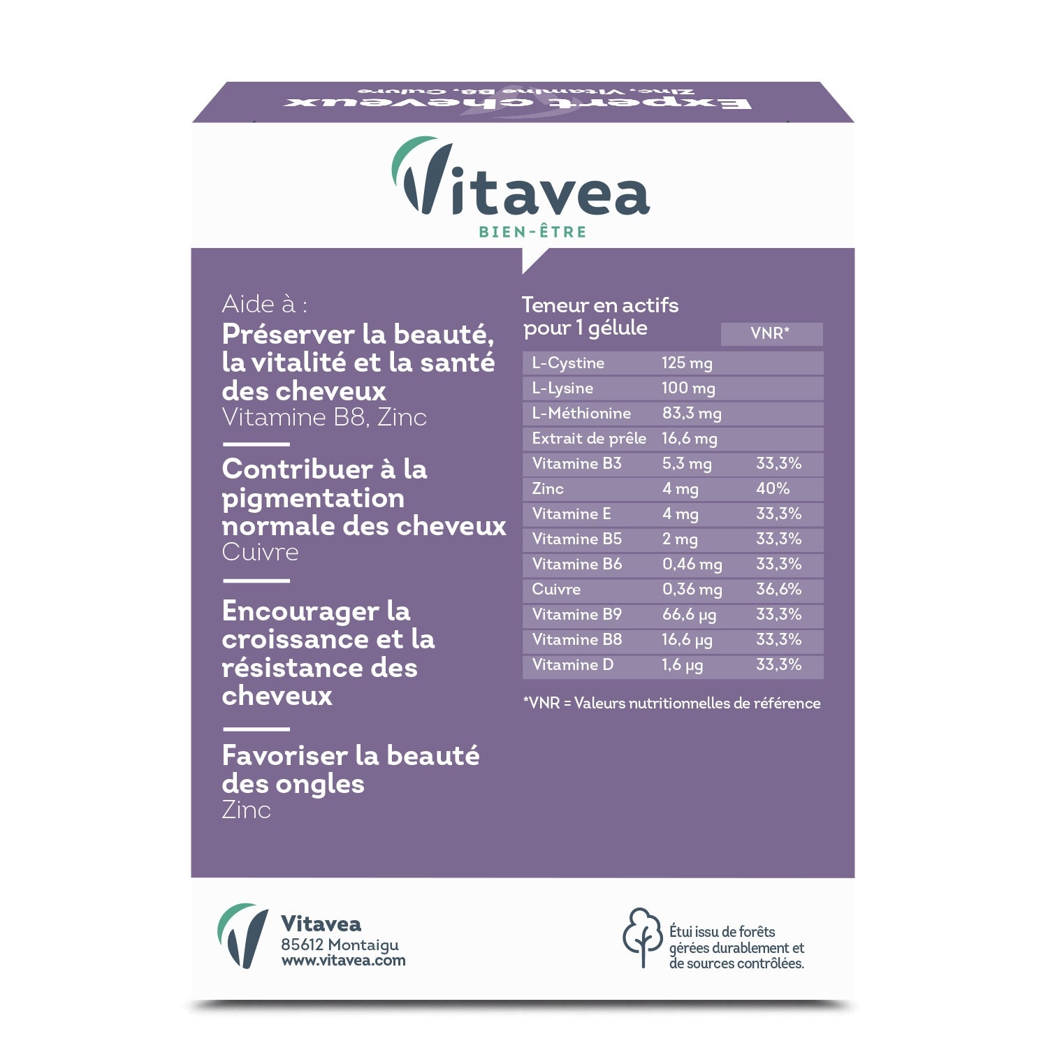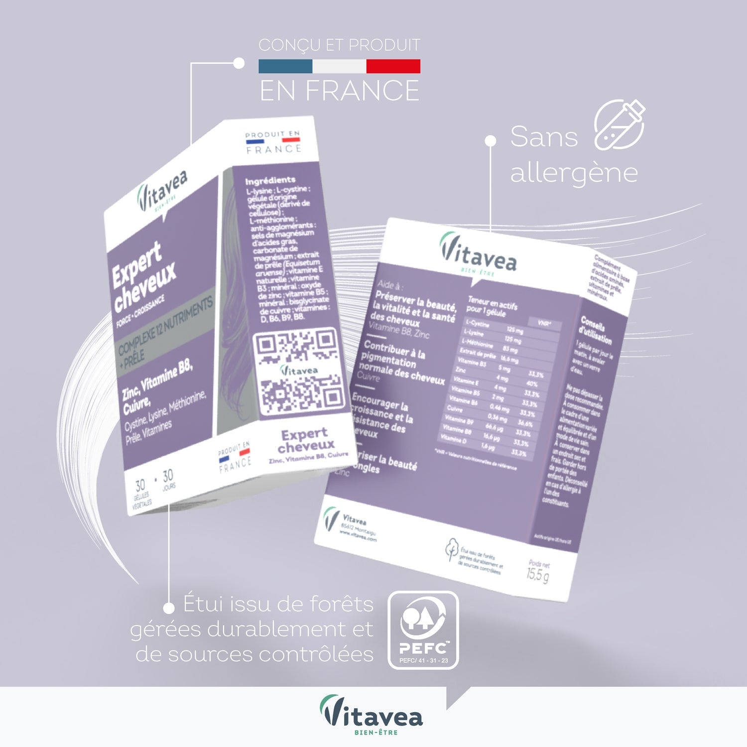 The VITAVEA BIEN-ÊTRE HAIR EXPERT formula is your ally for preserving the beauty, vitality, and health of your hair. This dietary supplement, enriched with zinc, vitamin B8, copper, cystine, lysine, methionine, as well as vitamins and horsetail, helps promote the beauty, growth, and strength of hair and nails. Find your VITAVEA BIEN-ÊTRE products in all your favorite supermarkets.