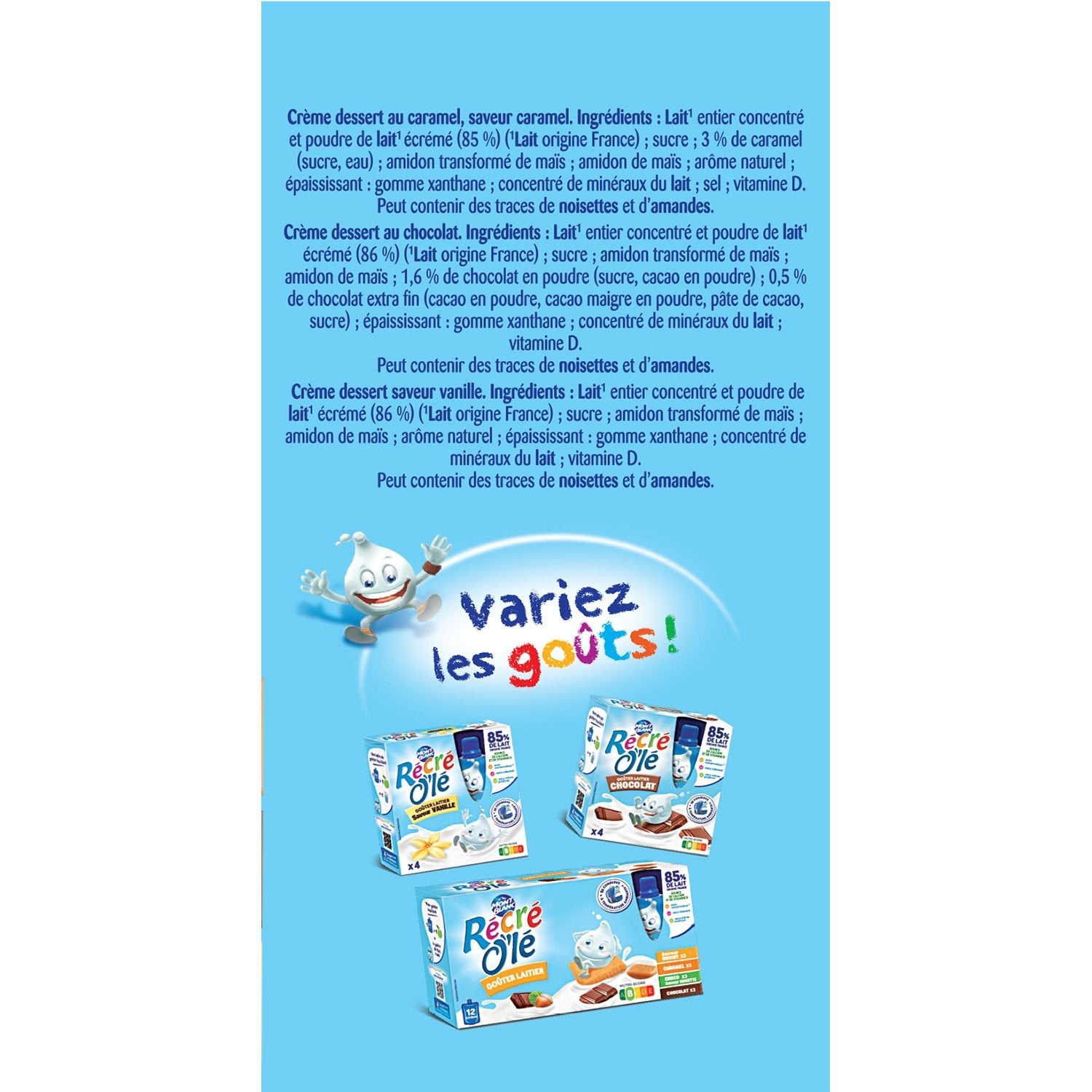 CARAMEL: MILK from France 85% (concentrated whole MILK, skimmed MILK powder), sugar, caramel 3% (sugar, water), processed corn starch, corn starch, natural flavoring, thickener: xanthan gum, MILK mineral concentrate, salt, vitamin D. CHOCOLATE: MILK from France 86% (concentrated whole MILK, skimmed MILK powder), sugar, processed corn starch, corn starch, chocolate powder 1.5% (sugar, cocoa powder), extra fine chocolate 0.5% (cocoa powder, fat-reduced cocoa powder, cocoa mass, sugar), thickener: xanthan gum, MILK mineral concentrate, vitamin D. VANILLA FLAVOR: MILK from France 85% (concentrated whole MILK, skimmed MILK powder), sugar, processed corn starch, corn starch, natural flavoring, thickener: xanthan gum, MILK mineral concentrate, vitamin D.
