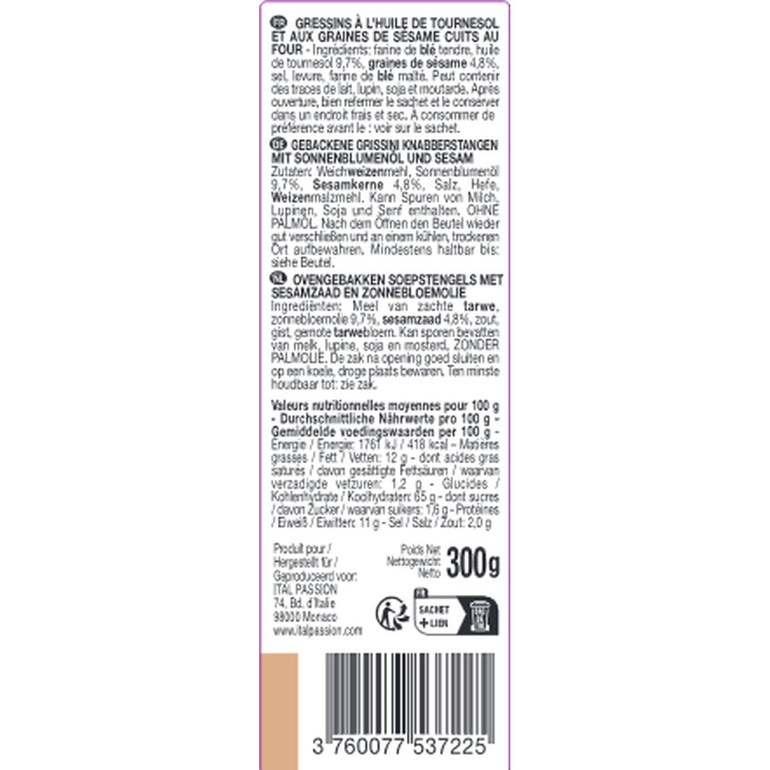Ingredients: Soft wheat flour, sunflower oil (9.7%), SESAME seeds (4.8%), salt, yeast, malted wheat flour. May contain traces of MILK, lupin and SOYA.