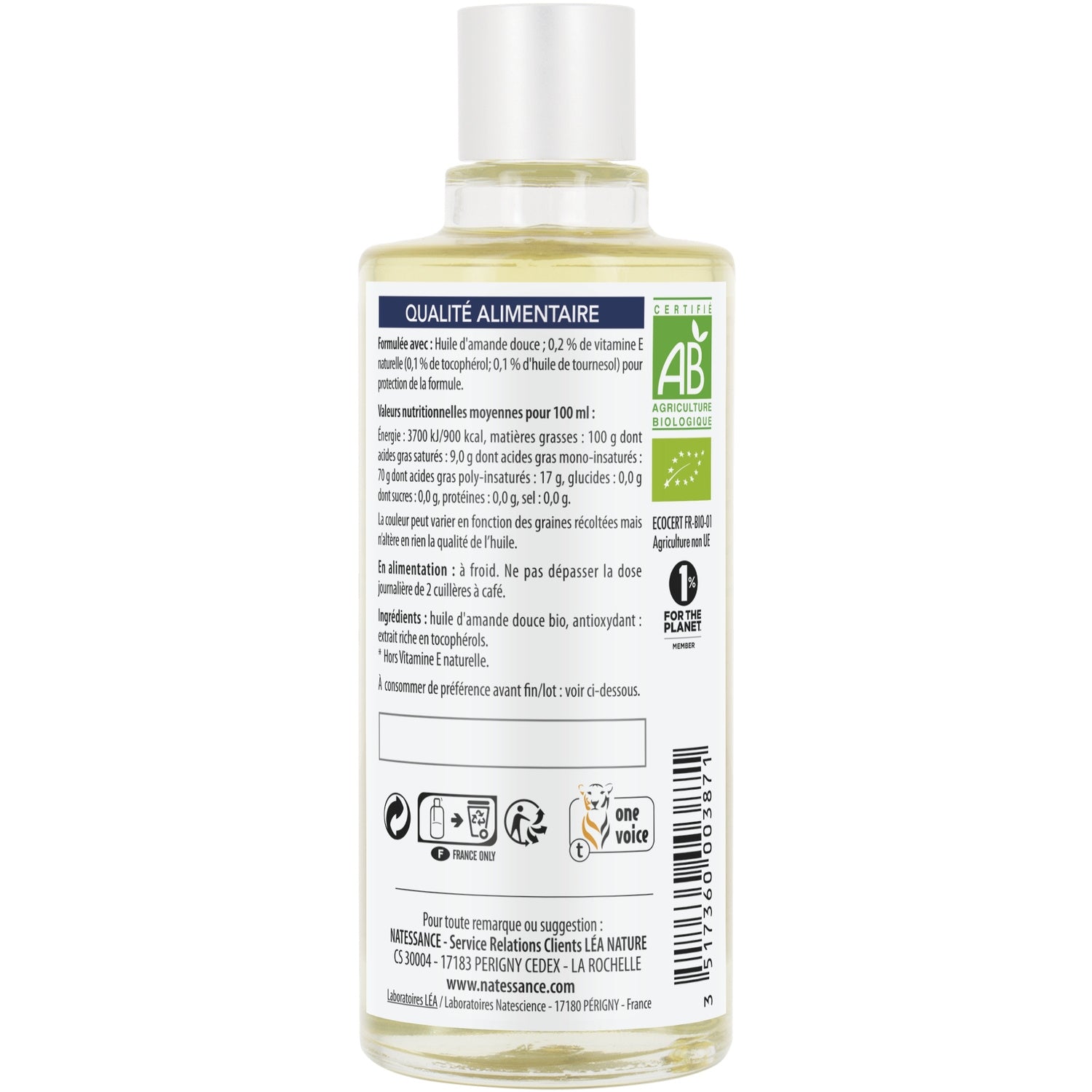 Organic sweet almond oil, antioxidant: extract rich in tocopherols. Average nutritional values per 100 ml: Energy: 3700 kJ/ 900 kcal, Fat: 96 g of which saturates: 9.0 g of which monounsaturated fatty acids: 70 g of which polyunsaturated fatty acids: 17 g, Carbohydrates: 0.0 g of which sugars: 0.0 g, Protein: 0.0 g, Salt: 0.0 g.