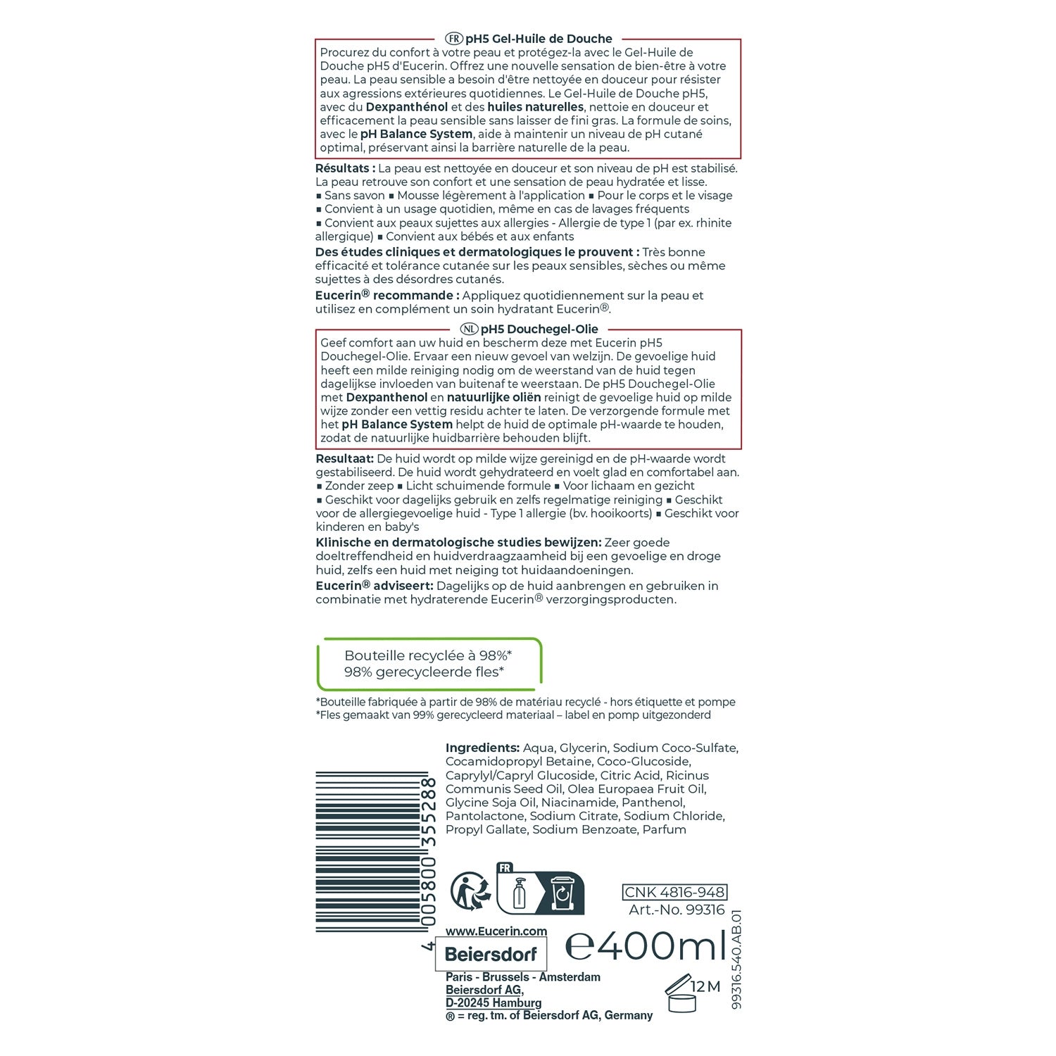 Comfort and protect your skin with Eucerin pH5 Shower Oil-Gel. Indulge your skin in a new sense of well-being. Sensitive skin needs gentle cleansing to resist daily external aggressors. pH5 Shower Oil-Gel, with Dexpanthenol and natural oils, gently and effectively cleanses sensitive skin without leaving a greasy finish. The caring formula, with the pH Balance System, helps maintain an optimal skin pH level, preserving the skin's natural barrier. Results: Skin is gently cleansed and its pH level is stabilized. Skin regains comfort and a feeling of hydrated and smooth skin. ■ Soap-free ■ Foams slightly upon application ■ Suitable for daily use, even with frequent washing ■ Suitable for allergy-prone skin - Type 1 allergy (e.g. allergic rhinitis) ■ Suitable for babies and children Clinical and dermatological studies prove it: Very good efficacy and skin tolerance on sensitive, dry skin or even skin prone to skin disorders. 98% recycled bottle* *Bottle made from 98% recycled material - excluding label and pump.