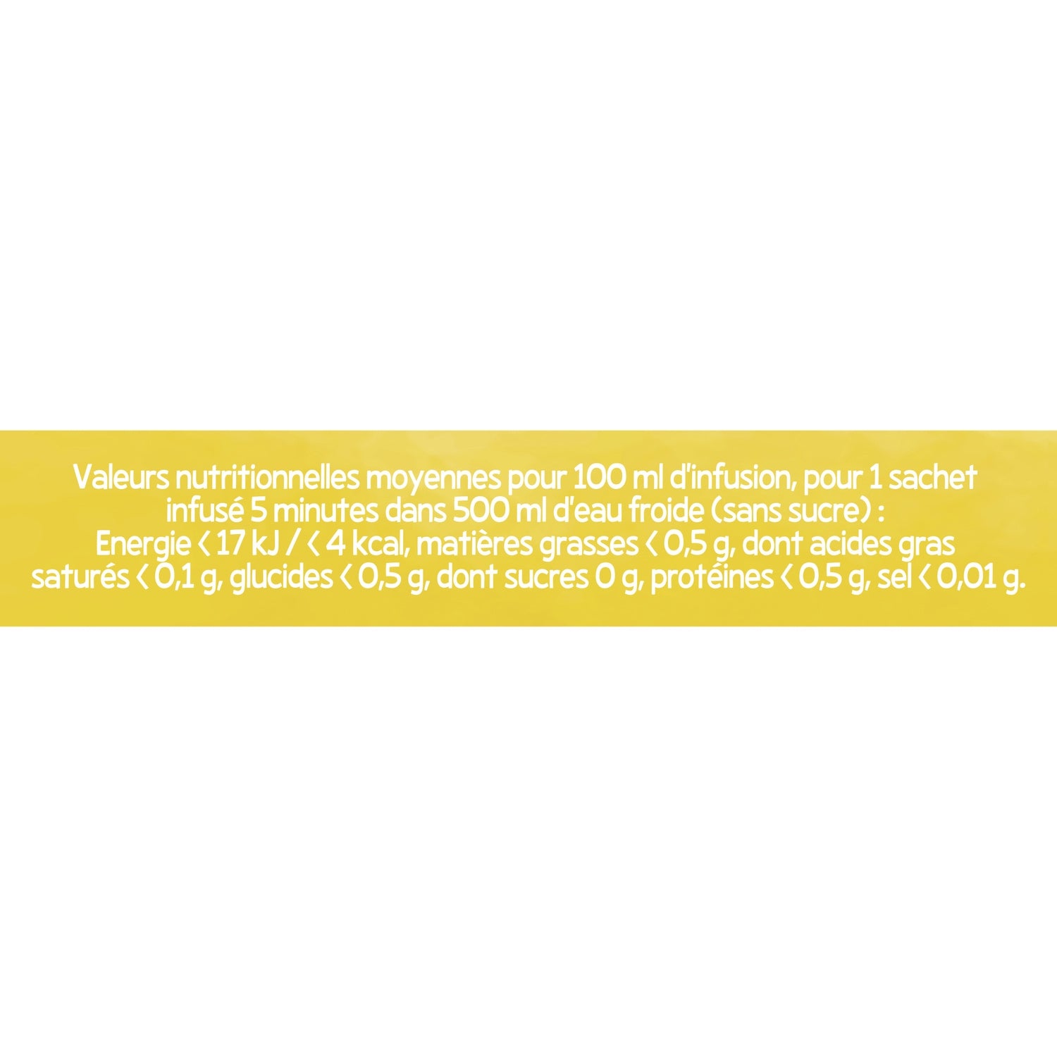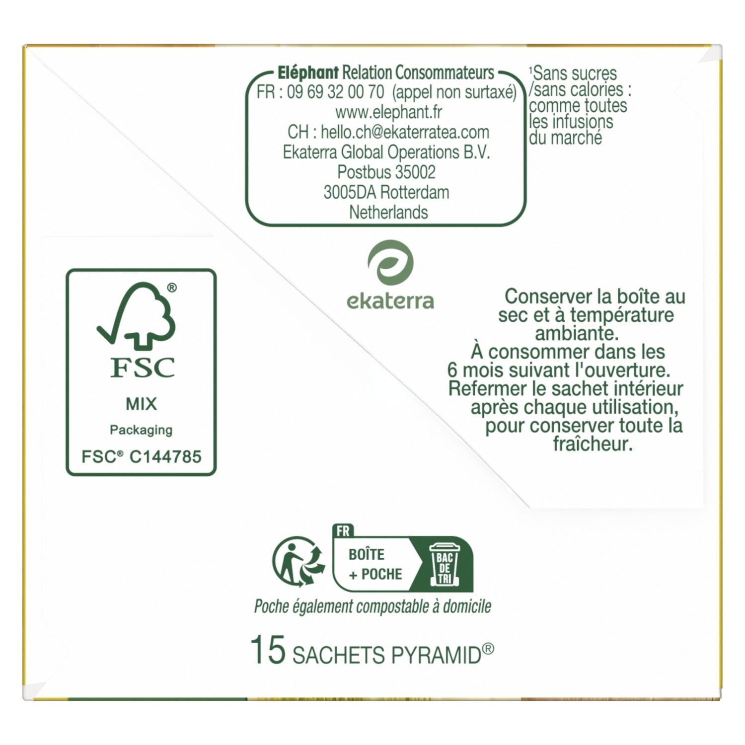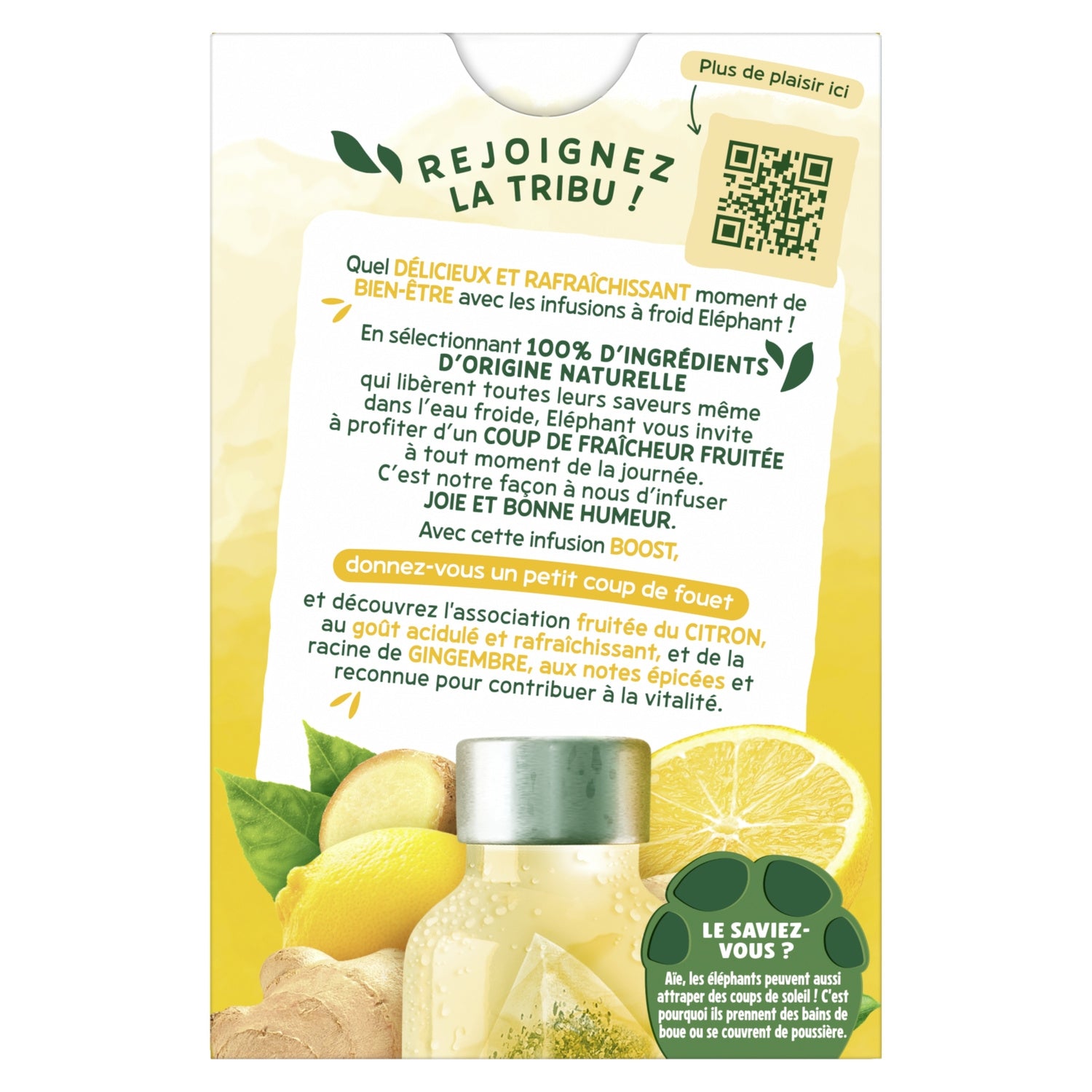 With the 15 Pyramid® Bags of Elephant Lemon Ginger Boost Cold Infusion, flavor your water naturally and treat yourself to a delicious and refreshing moment of well-being! With this Boost cold infusion, give yourself a little boost and discover the combination of lemon, with its tangy and refreshing taste, and ginger root, with its spicy notes, known to contribute to vitality. By selecting 100% ingredients of natural origin that release all their flavors even in cold water, Elephant invites you to enjoy a burst of fruity freshness at any time of the day. It's our way of infusing joy and good humor. Elephant Cold Infusion recipes are composed exclusively of plants, fruits, and natural flavors. They are sugar-free, calorie-free, and caffeine-free. Elephant has selected the best of plants for you. For the perfect tasting experience, let the Pyramid® infusion bag steep for 5 minutes in 500 ml of cold water, shake, and enjoy! Because we love our planet, no more plastic wrap. As for our boxes, they are recyclable and made from cardboard from sustainably managed forests. The inner packaging is made from wood pulp that can be composted at home. And our bags? To wrap everyone up, they are plant-based and uncoated. The Elephant adventure began in 1896 and continues today. Which, as far as elephants can remember, makes for quite an experience for an infusion creator... His greatest pleasure, since always, has been to excite our taste buds! Elephant makes listening to nature a real strength, which he uses to choose the best plants and fruits and concoct delicious, unique infusions that are appreciated by all. But make no mistake, Eléphant*, the French people's favorite brand, in its great generosity, also adds kindness, simplicity, a touch of humor, and a touch of originality. So, join the tribe and discover all the other delicious recipes in our Cold Brew range. *Eléphant, value & volume leader in France — Nielsen year 2022