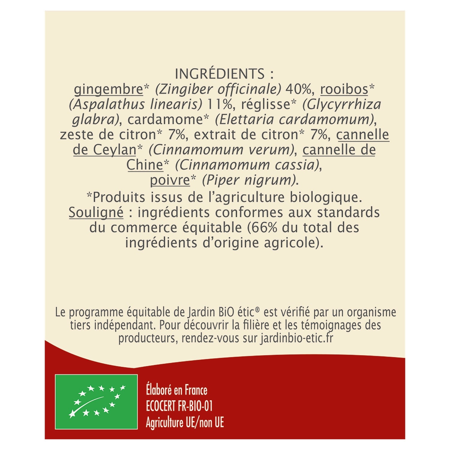 Ingredients: Ginger* (Zingiber officinale) 40%, Rooibos* (Aspalathus linearis) 11%, Licorice* (Glycyrrhiza glabra), Cardamom* (Elettaria cardamomum), Lemon peel* 7%, Lemon extract* 7%, Ceylon cinnamon* (Cinnamomum verum), Chinese cinnamon* (Cinnamomum cassia), Pepper* (Piper nigrum). *Products from organic farming. 66% of the total ingredients of agricultural origin comply with Fair Trade standards (ginger, rooibos, Ceylon cinnamon, Chinese cinnamon and pepper).