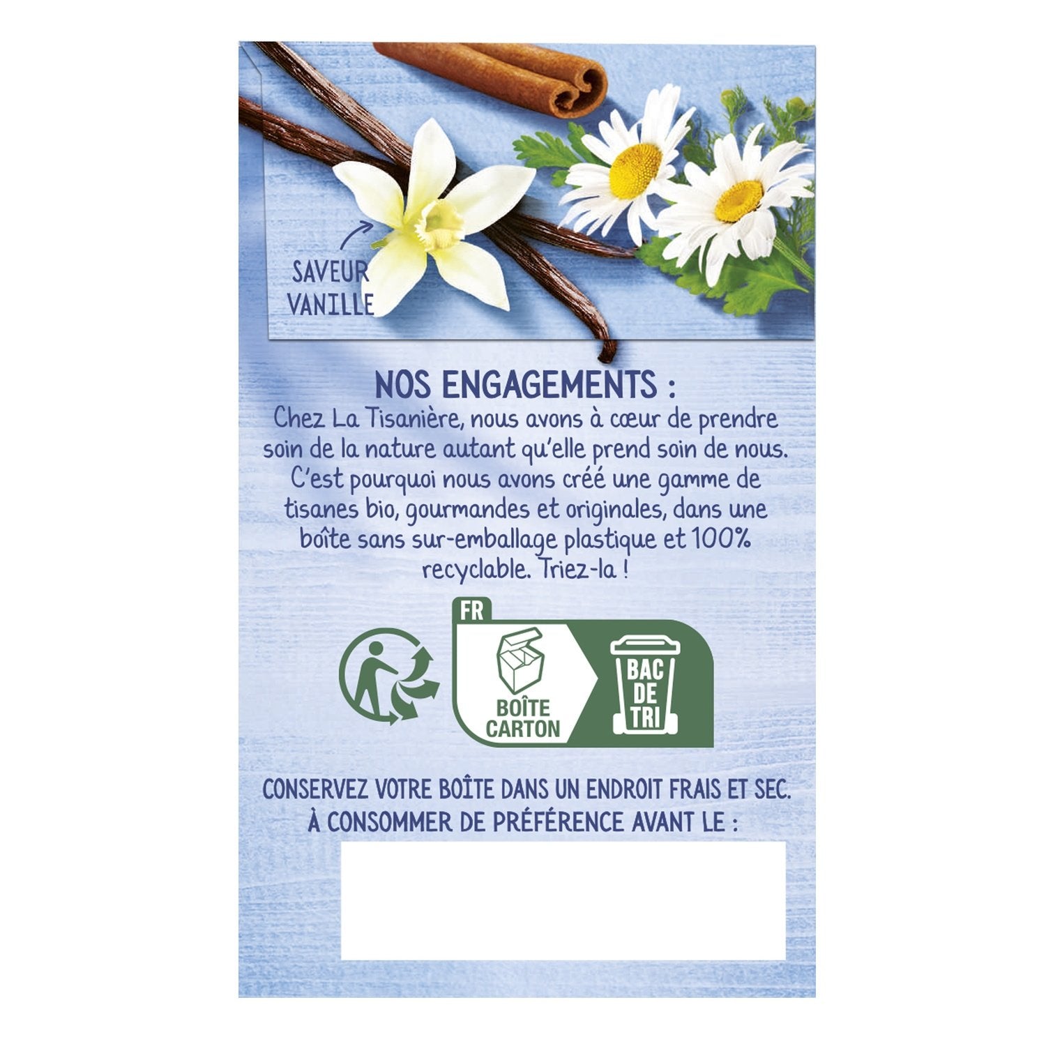 This naturally comforting herbal tea with a delicate hazelnut flavor and vanilla notes has been lovingly crafted. At La Tisanière, we're committed to your well-being and the environment. That's why we've created a range of organic, delicious, and original herbal teas in a box with no plastic overwrap and is 100% recyclable. Sort it!