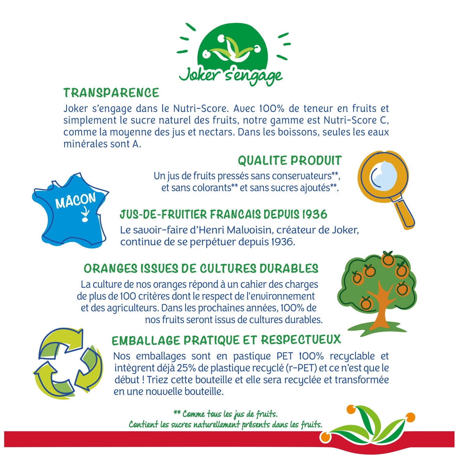 JOKER is committed to this delicious fruit juice with no preservatives*, no artificial colors*, and no added sugars*. With 100% pure pressed fruit juice and only the natural sugars in the fruit*, our range has a Nutri-Score C rating, the same as the average for juices and nectars. Ideal for breakfast with the family! Our packaging is 100% recyclable and already contains 25% recycled plastic (r-PET)! *Like all fruit juices. Contains the sugars naturally present in fruit.