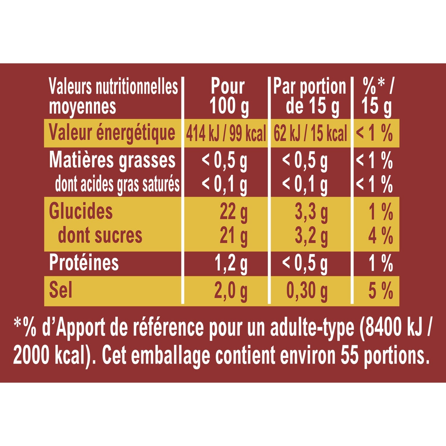 The information presented (ingredients, nutritional values, usage instructions, etc.) is provided for informational purposes only and may vary depending on supplies. We invite you to systematically check the information on the packaging before consumption. Non-contractual photo - the appearance, packaging or certain details of the product may differ from the illustration. The design of the packaging is subject to change .
