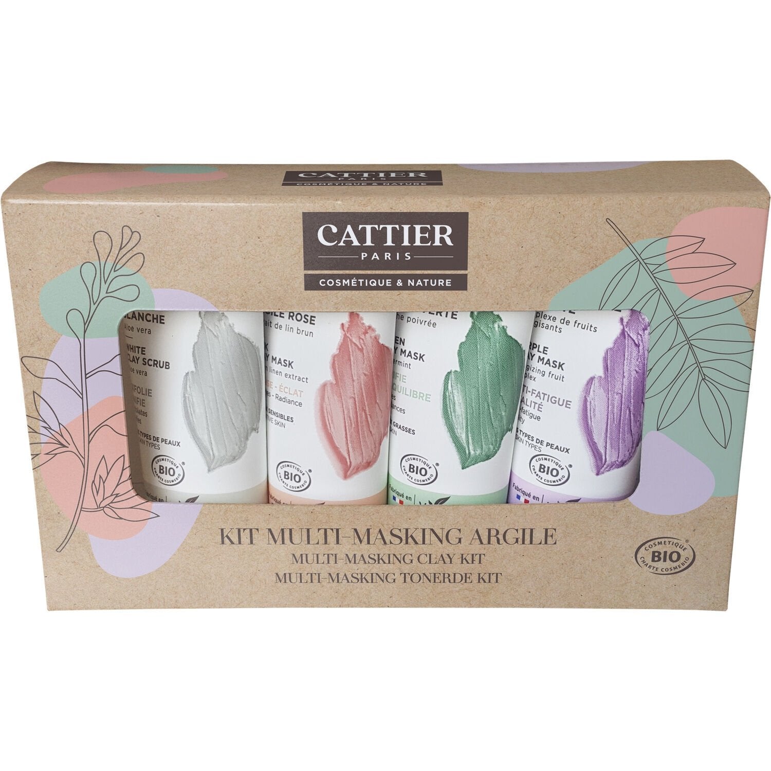 Combine the benefits of Cattier clay masks for a personalized beauty ritual! In 5 steps, rediscover purified and radiant skin! Mini white clay scrub - 30ml Gently exfoliates the skin and evens out the complexion. DIRECTIONS FOR USE: Apply the scrub to the face and neck, avoiding the eye and lip area. Gently massage in small circular motions, then rinse thoroughly with warm water. Mini green clay mask - 30ml Purifies and rebalances the skin. Mini pink clay mask - 30 ml Revives the complexion's radiance and soothes the skin. Mini purple clay mask - 30 ml Brightens the complexion and brings vitality to the skin. DIRECTIONS FOR USE OF THE MASK: Apply a thick layer to the face and neck, avoiding the eye and lip area. Leave on for 10 minutes and rinse with warm water.