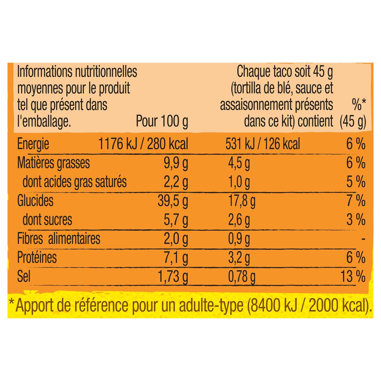WHEAT Tortillas (62%): WHEAT flour (61%), water, vegetable oils (rapeseed, sunflower), stabilizer (glycerol), WHEAT GLUTEN, raising agents (sodium bicarbonate, diphosphate, calcium phosphate), emulsifier (mono and diglycerides of fatty acids), dextrose, salt. Cooking sauce (36%): Tomato paste (37%), water, CREAM, sugar, sunflower oil, flavorings, smoke flavoring, salt, spices, concentrated lemon juice, modified corn starch, garlic powder, onion powder, coriander leaves, acidity regulator (citric acid). Seasoning (2%): Salt, onion powder (18%), sugar, YOGURT powder, dextrose, MILK powder, WHEY powder, BUTTERMILK powder, yeast extract, acidity regulators (lactic acid, malic acid, citric acid), garlic powder, parsley, sour cream powder, natural flavoring (contains MILK), anti-caking agent (tricalcium phosphate), flavoring, natural flavoring, rosemary extract. Allergens: see ingredients in CAPITALS. Due to supply difficulties with certain raw materials linked to the war in Ukraine, changes have been made to the product recipe. The information given on the product may be inconsistent with the recipe. A labeling exemption has been granted by the DGCCRF. You will find details of the changes made at: https://www.economie.gouv.fr/dgccrf/rechercher-produit-recette-temporairement-modifiee