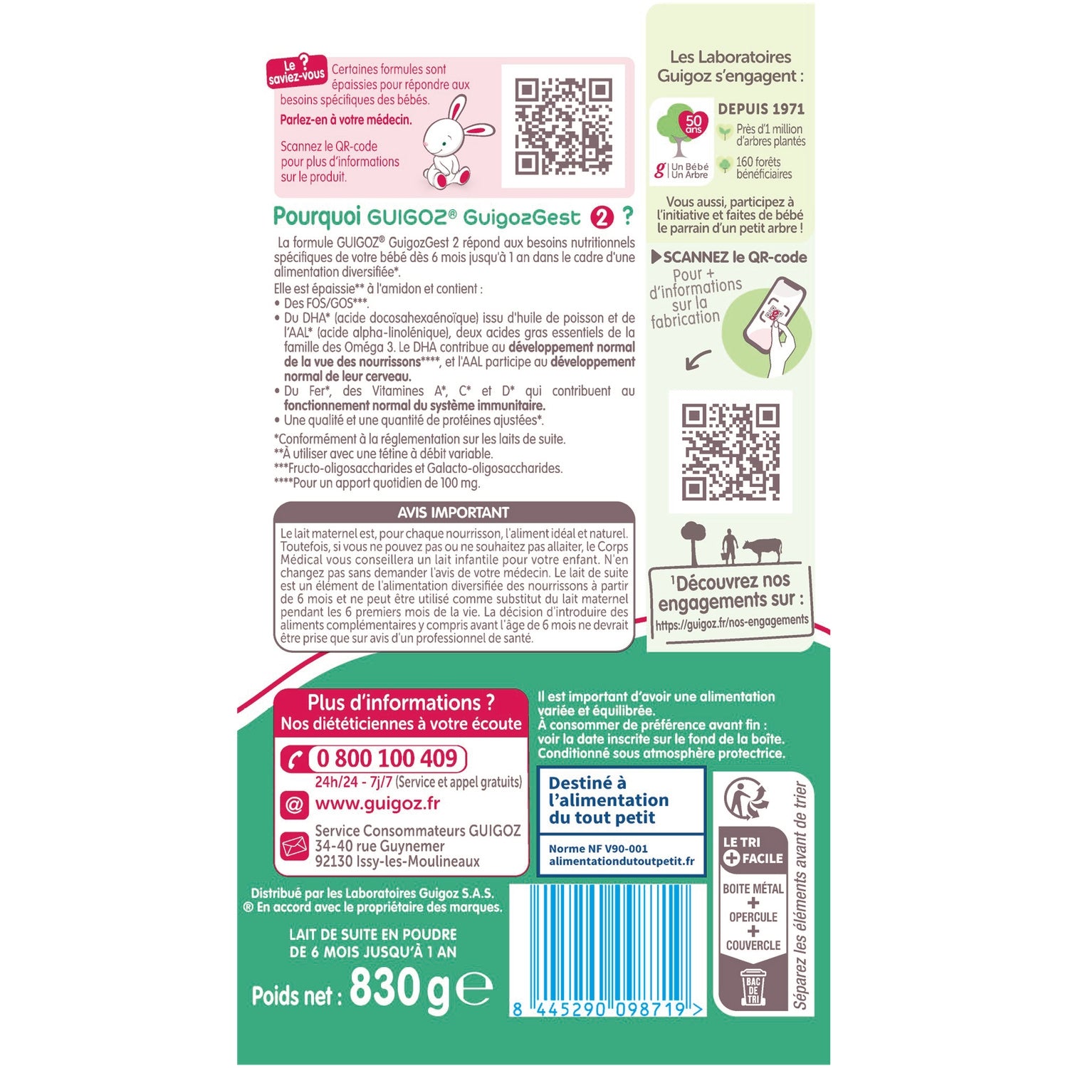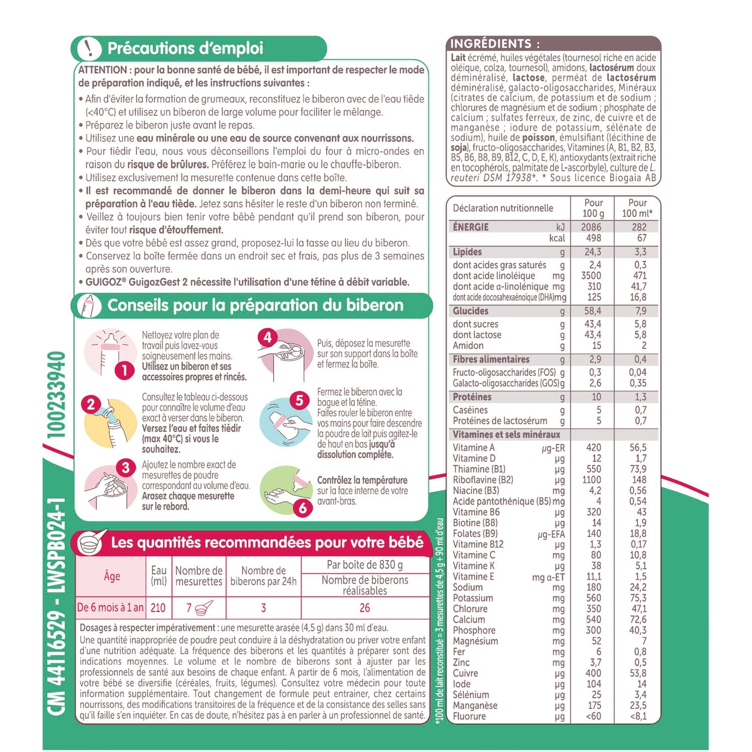 Why GuigozGest 2? The GuigozGest 2 formula meets the specific nutritional needs of your baby from 6 months to 1 year as part of a diversified diet*. It is thickened** with starch and contains: FOS/GOS***. DHA* (docosahexaenoic acid) from fish oil and ALA* (alpha-linolenic acid), two essential fatty acids from the Omega 3 family. DHA contributes to the normal development of infants' eyes****, and ALA participates in the normal development of their brain. Iron*, Vitamins A*, C* and D* which contribute to the normal function of the immune system. Adjusted protein quality and quantity*. *In accordance with the regulations on follow-on milks. **To be used with a variable flow teat. ***Fructo-oligosaccharides and Galacto-oligosaccharides. **** for a daily intake of 100 mg.