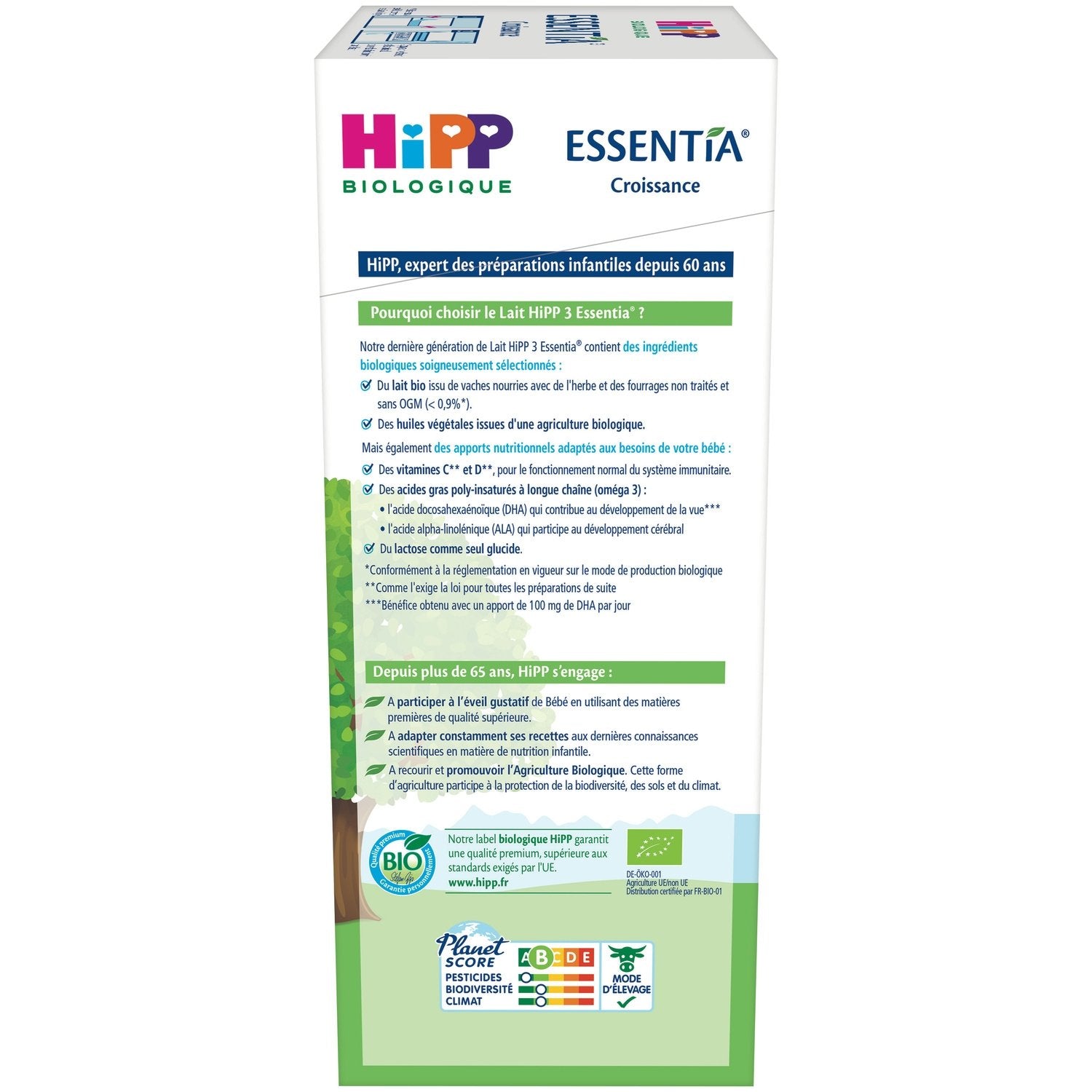 HiPP, expert in infant formula for 60 years Why choose HiPP 3 Essentia Milk? Our latest generation of HiPP 3 Essentia® Milk contains carefully selected organic ingredients: ✔ Organic milk from cows fed with grass and untreated, GMO-free fodder (< 0.9%*). ✔ Vegetable oils from organic farming. But also nutritional benefits adapted to your baby's needs: ✔ Vitamins C** and D**, for the normal functioning of the immune system. ✔ Long-chain polyunsaturated fatty acids (omega 3): • docosahexaenoic acid (DHA) which contributes to the development of eyesight*** • alpha-linolenic acid (ALA) which contributes to brain development ✔ Lactose as the only carbohydrate. *In accordance with current regulations on organic production **As required by law for all follow-on formulas ***Benefit obtained with an intake of 100 mg of DHA per day