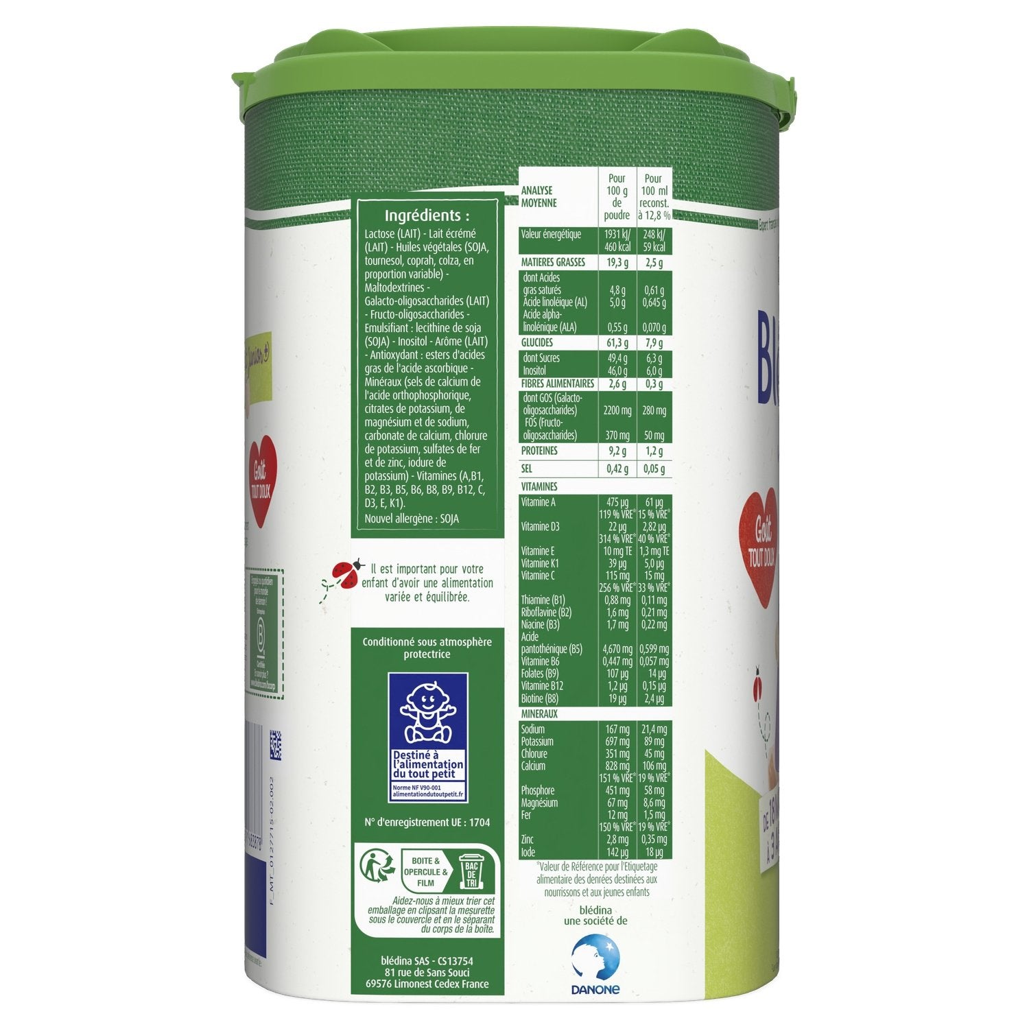 Ingredients: Lactose (MILK) - Skimmed MILK (MILK) - Vegetable oils (SOY, sunflower, coconut, rapeseed, in varying proportions) - Maltodextrins - Galacto-oligosaccharides (MILK) - Fructo-oligosaccharides - Emulsifier: SOY lecithin (SOY) - Inositol - Flavoring (MILK) - Antioxidant: ascorbic acid fatty acid esters - Minerals (calcium salts of orthophosphoric acid, potassium, magnesium and sodium citrates, calcium carbonate, potassium chloride, iron and zinc sulfates, potassium iodide) - Vitamins (A, B1, B2, B3, B5, B6, B8, B9, B12, C, D3, E, K1). New allergen: SOY